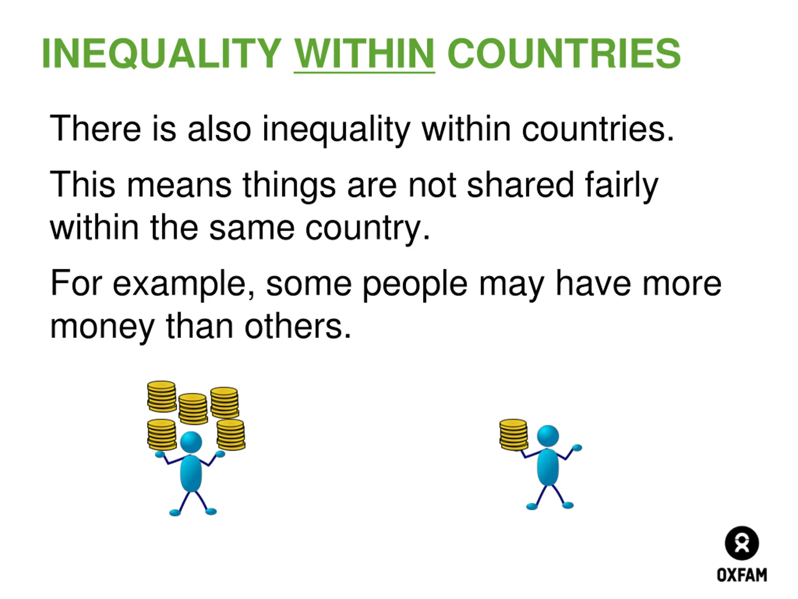 INEQUALITY WITHIN COUNTRIES There is also inequality within countries. This means things are not shared fairly within the same country. For example, some people may have more money than others.