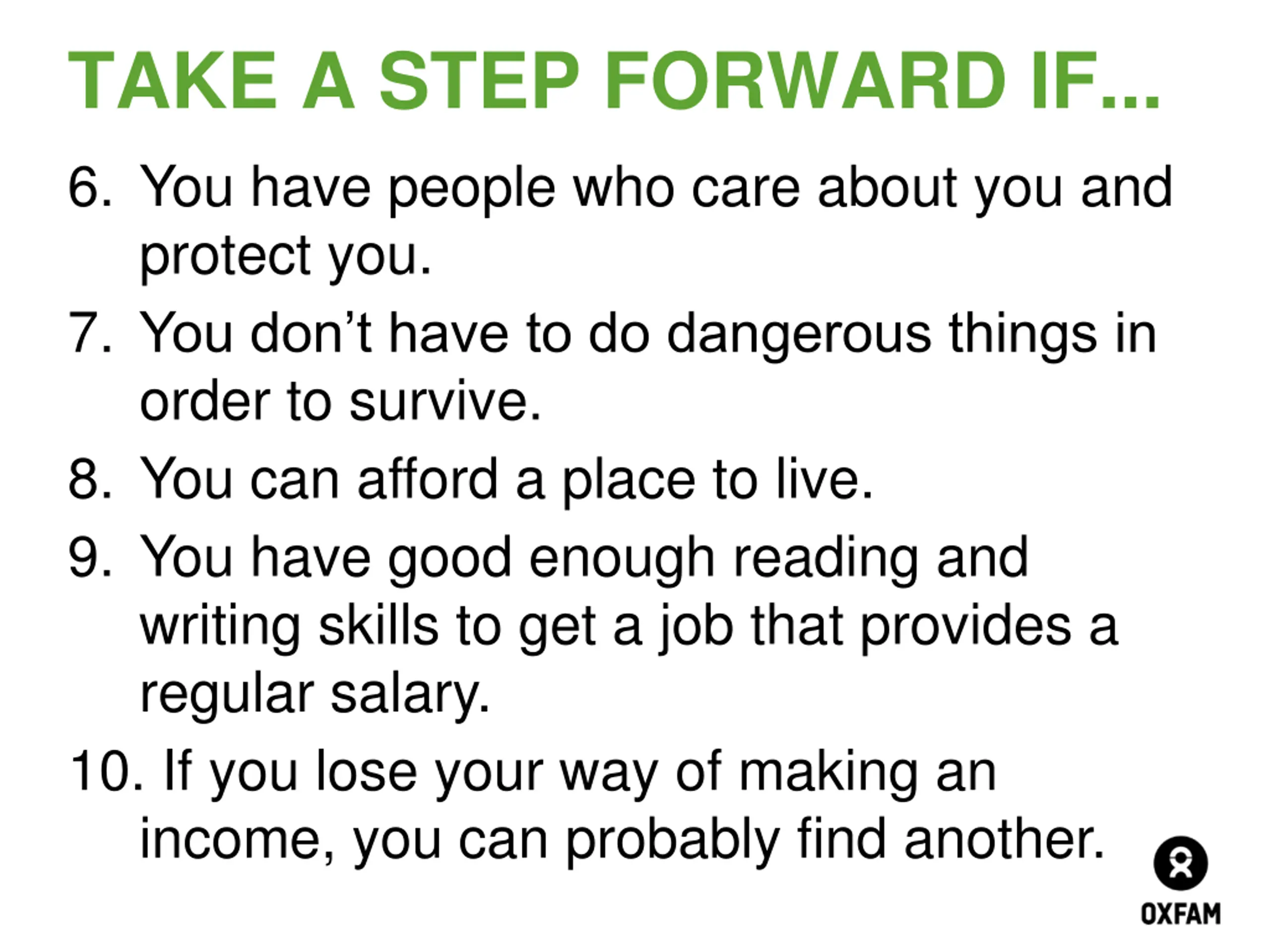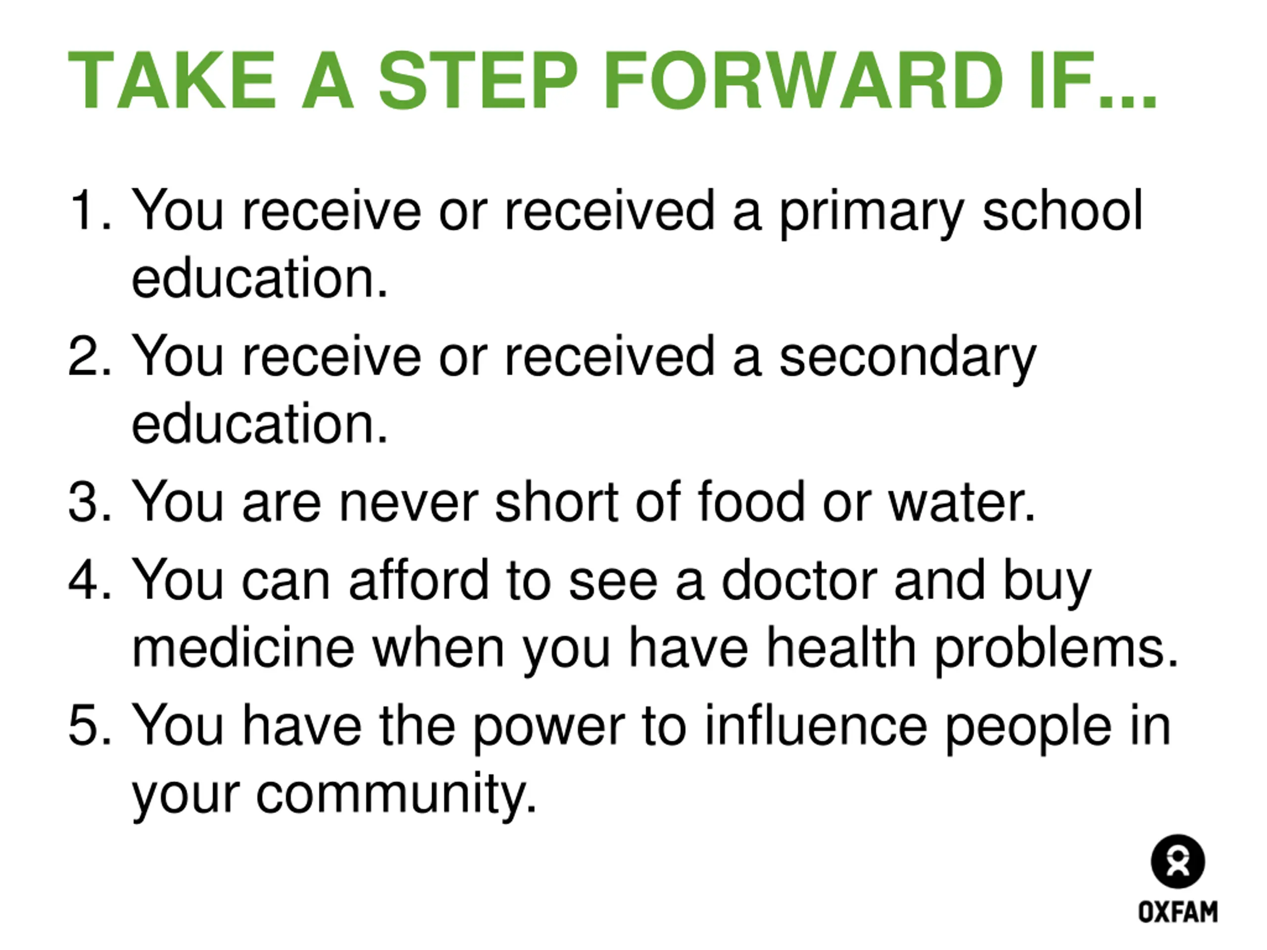 TAKE A STEP FORWARD IF... 1. You receive or received a primary school education. 2. You receive or received a secondary education. 3. You are never short of food or water. 4. You can afford to see a doctor and buy medicine when you have health problems. 5. You have the power to influence people in your community.