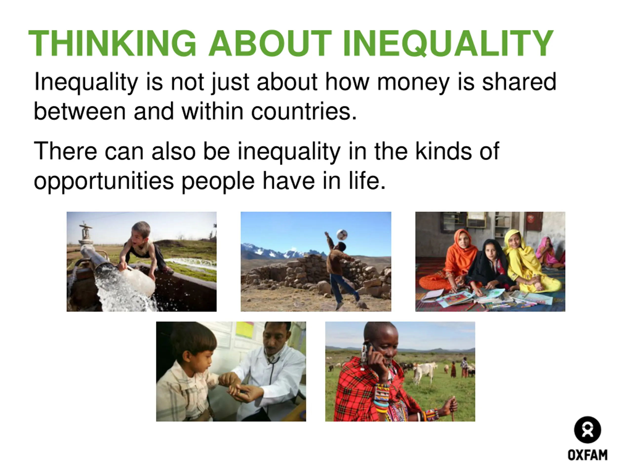 THINKING ABOUT INEQUALITY Inequality is not just about how money is shared between and within countries. There can also be inequality in the kinds of opportunities people have in life.