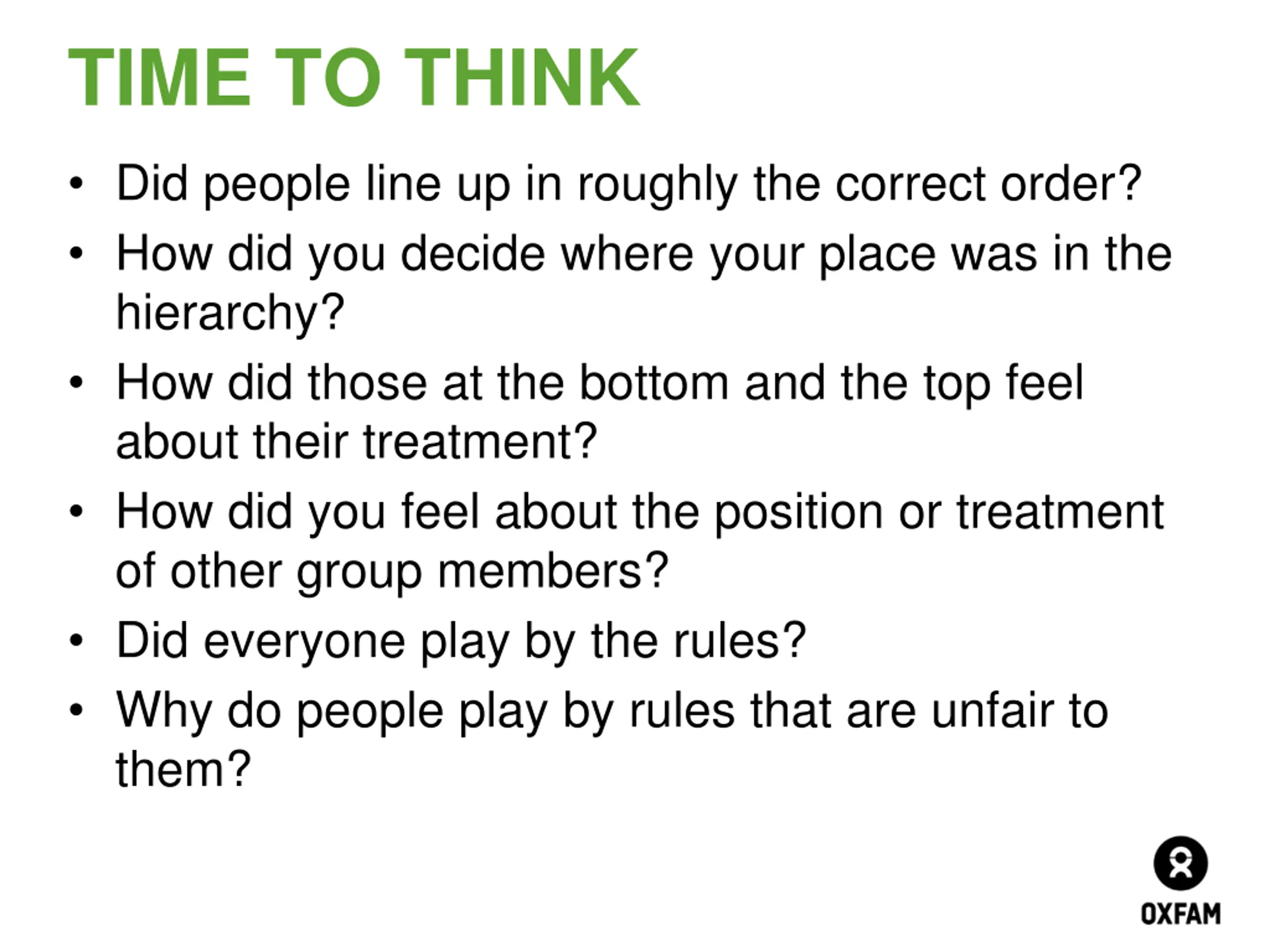 TIME TO THINK Did people line up in roughly the correct order? How did you decide where your place was in the hierarchy? How did those at the bottom and the top feel about their treatment? How did you feel about the position or treatment of other group members? Did everyone play by the rules? Why do people play by rules that are unfair to them?