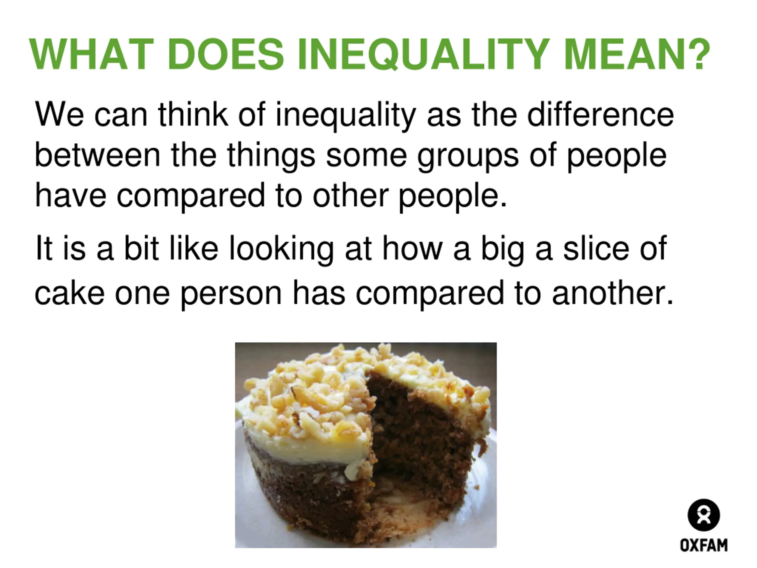 WHAT DOES INEQUALITY MEAN? We can think of inequality as the difference between the things some groups of people have compared to other people. It is a bit like looking at how a big a slice of cake one person has compared to another.