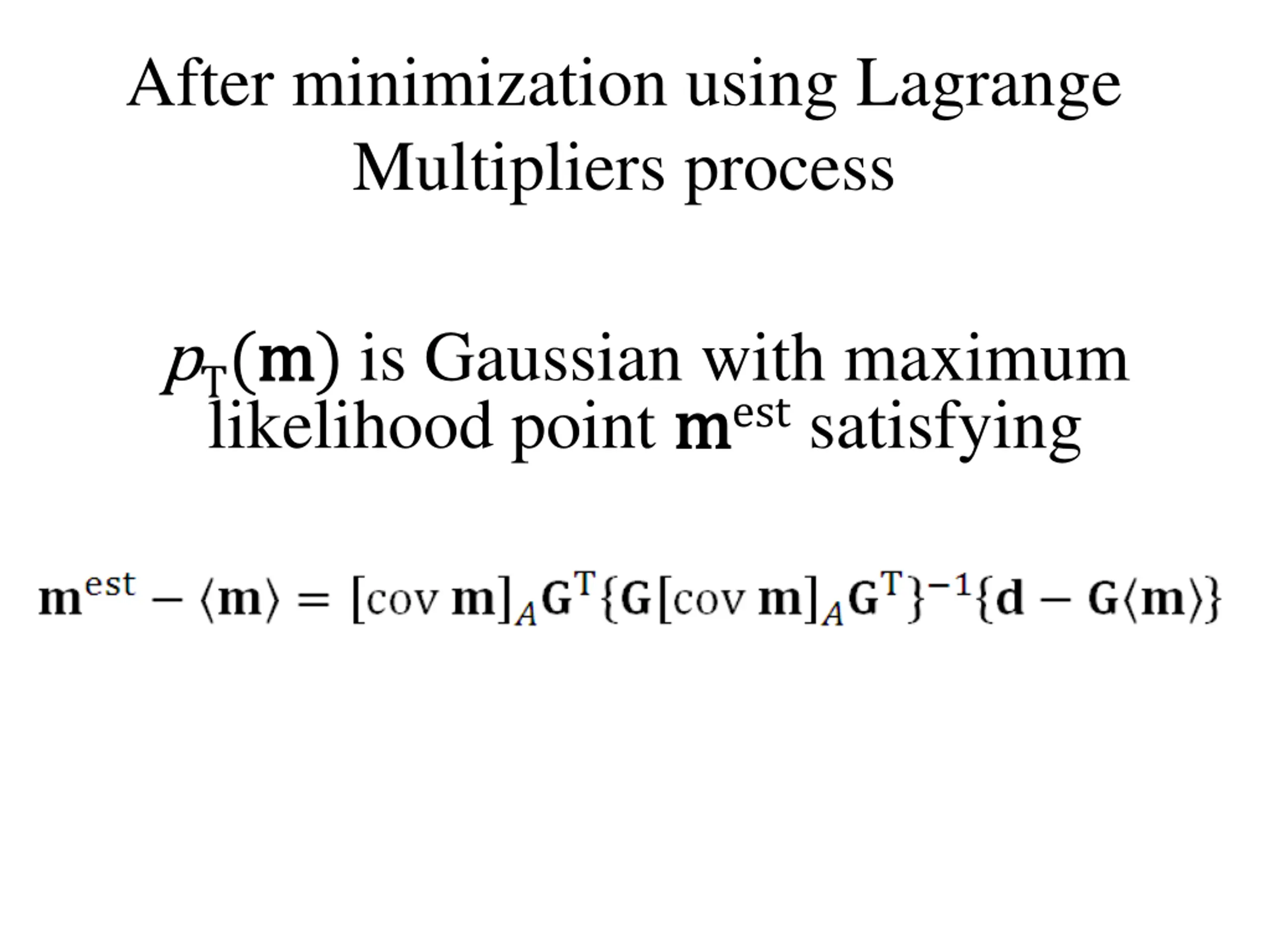After minimization using Lagrane Multipliers process pT(m m) is Gaussian with maximum likelihood point m mest satisfying just the weighted minimum length solution