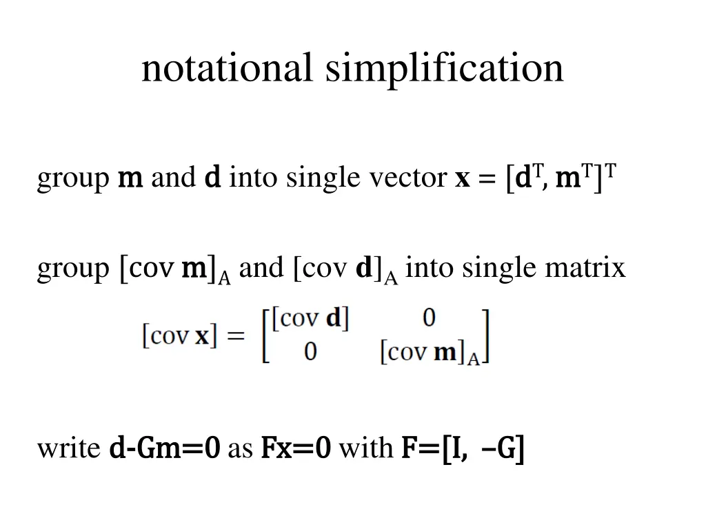 notational simplification group m m and d d into single vector x = [d dT, m mT]T group [cov m m]A and [cov d]A into single matrix write d d- -Gm=0 Gm=0 as Fx Fx=0 =0 with F=[I, F=[I, G] G]