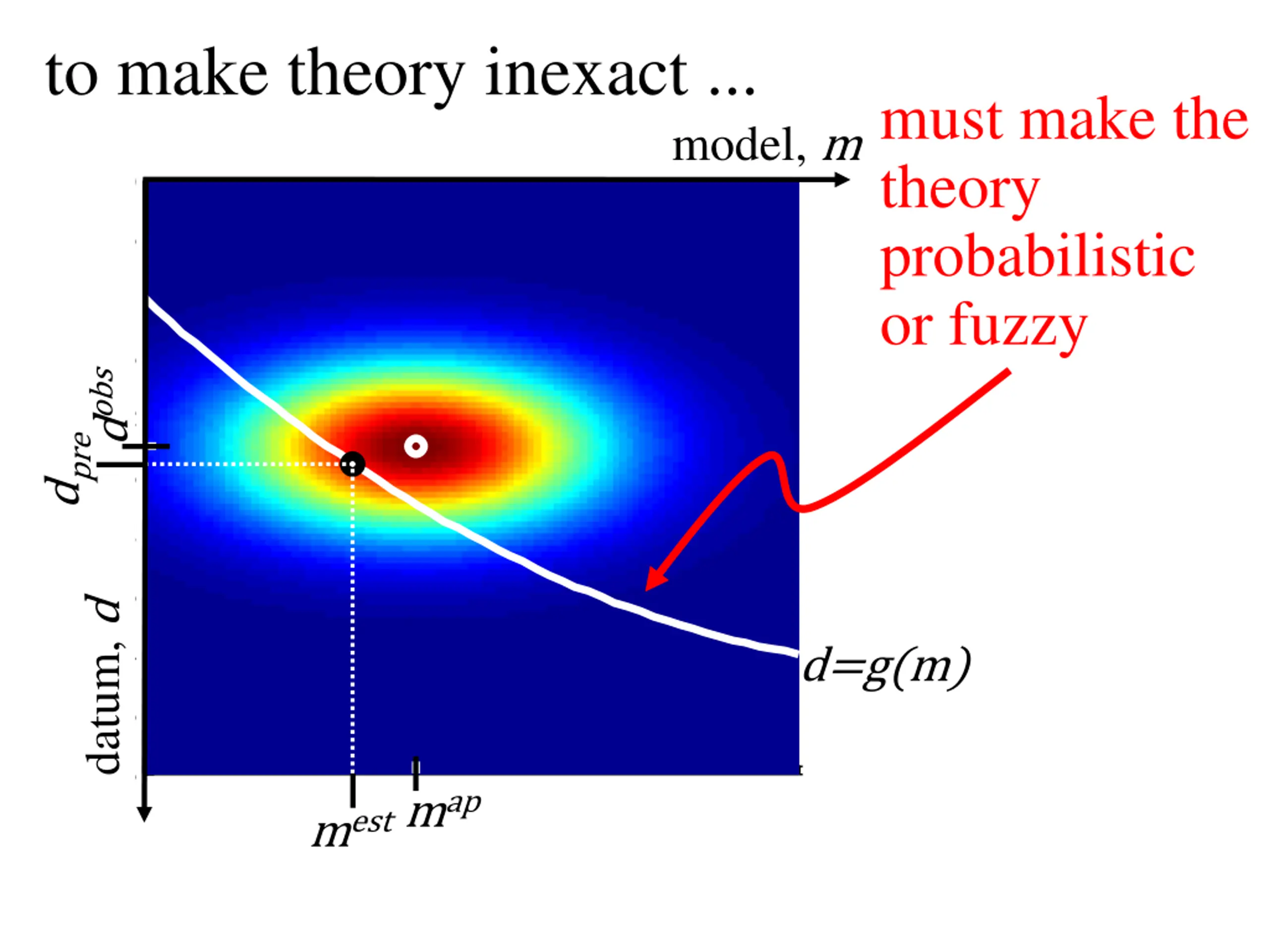 to make theory inexact ... must make the theory probabilistic or fuzzy model,m 0 0.5 1 1.5 dobs 2 d dpre 2.5 3 datum,d 3.5 4 d=g(m) 4.5 5 0 1 2 map 3 4 5 mest m