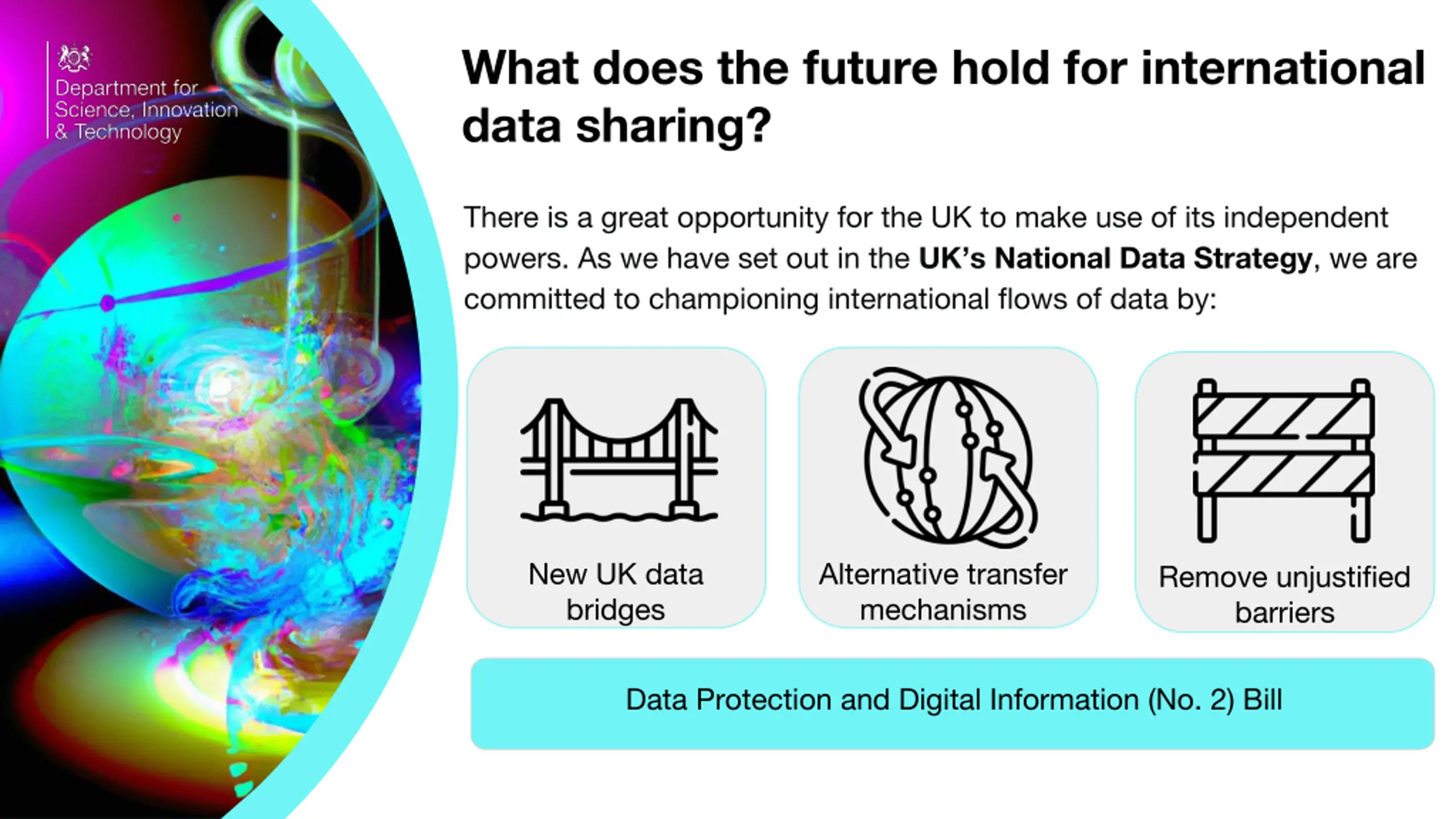 What does the future hold for international data sharing? There is a great opportunity for the UK to make use of its independent powers. As we have set out in the UK s National Data Strategy, we are committed to championing international flows of data by: New UK data bridges Alternative transfer mechanisms Remove unjustified barriers Data Protection and Digital Information (No. 2) Bill