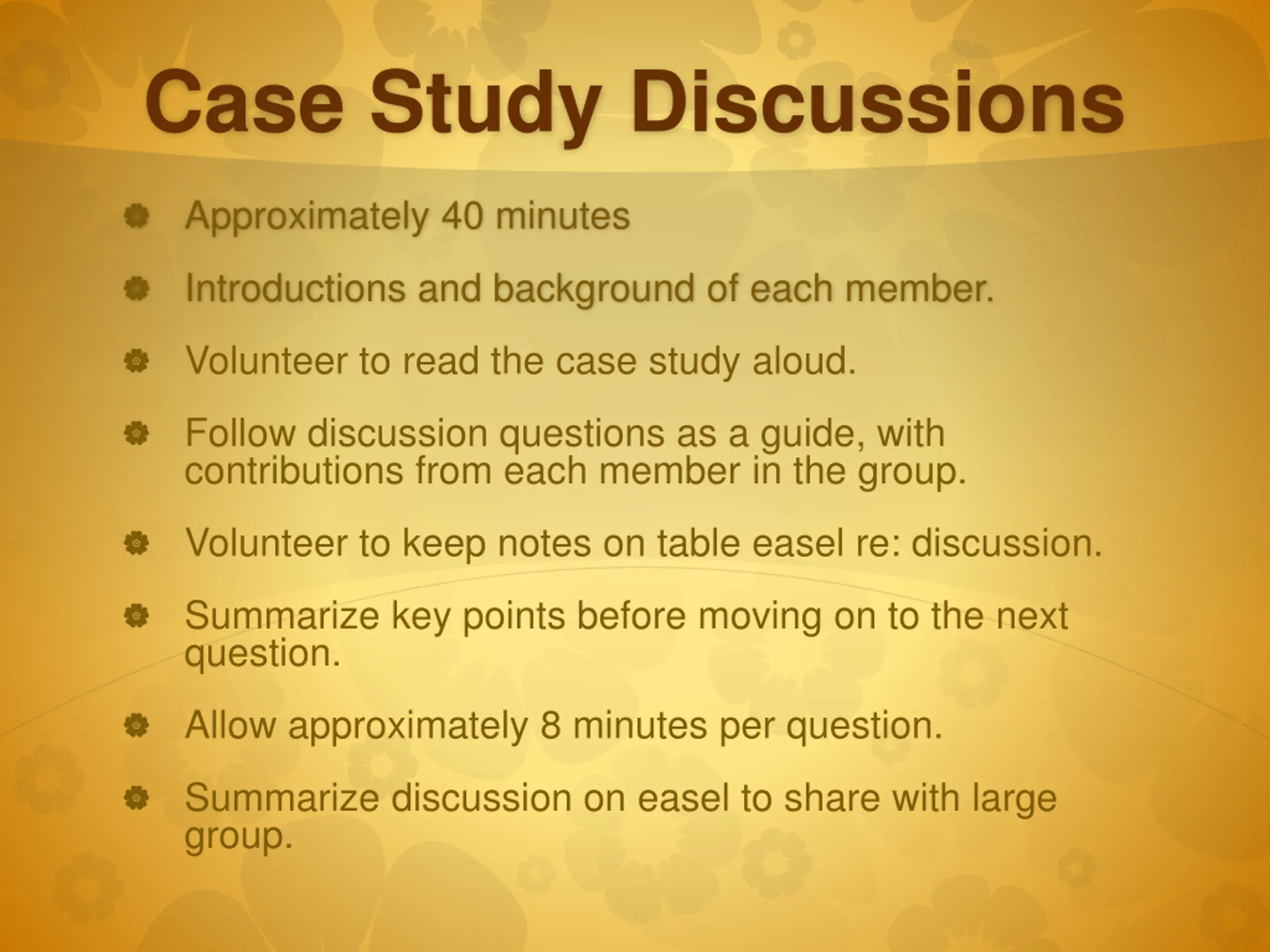 Case Study Discussions Approximately 40 minutes Introductions and background of each member. Volunteer to read the case study aloud. Follow discussion questions as a guide, with contributions from each member in the group. Volunteer to keep notes on table easel re: discussion. Summarize key points before moving on to the next question. Allow approximately 8 minutes per question. Summarize discussion on easel to share with large group.