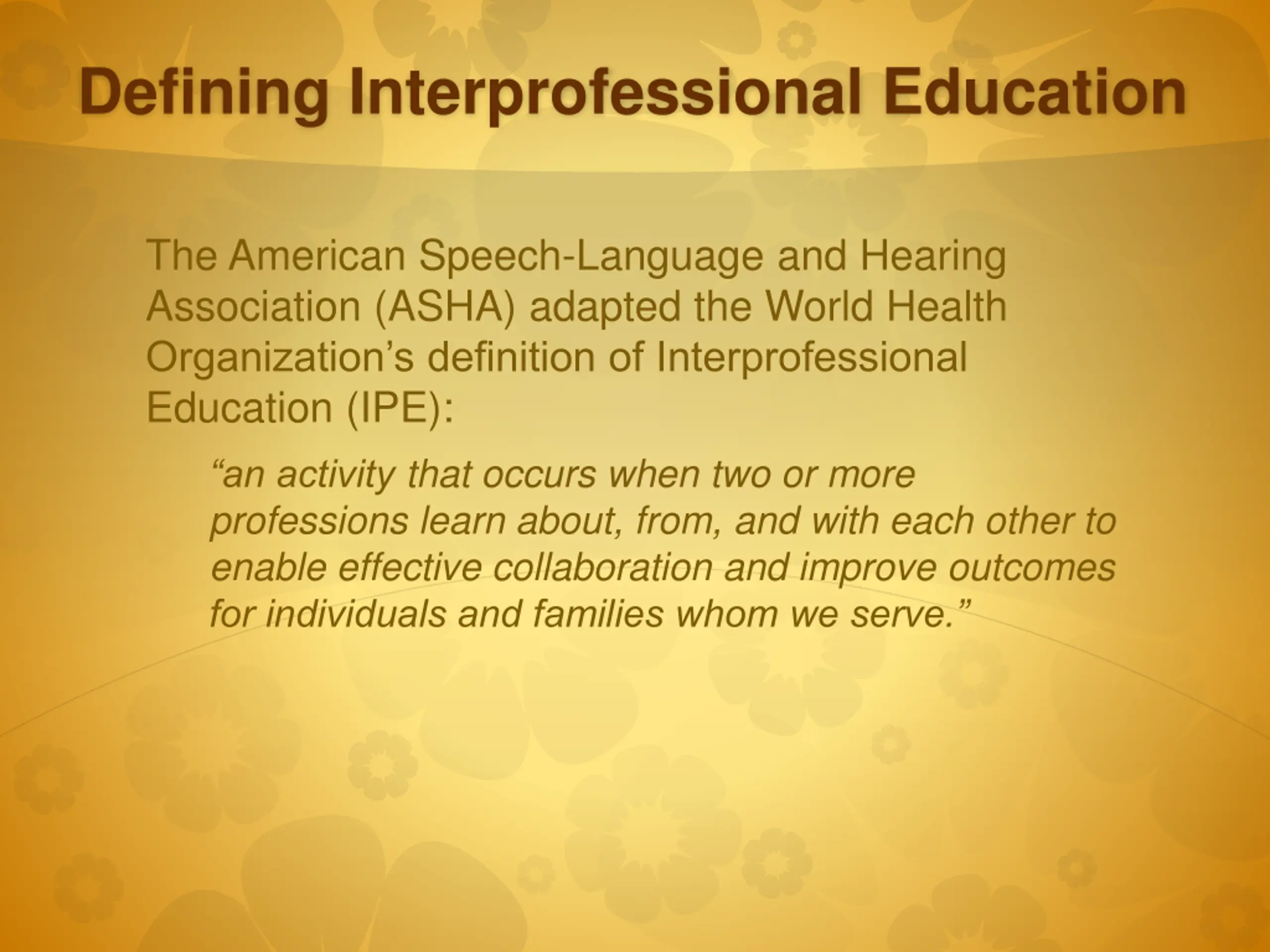 Defining Interprofessional Education The American Speech-Language and Hearing Association (ASHA) adapted the World Health Organization s definition of Interprofessional Education (IPE): an activity that occurs when two or more professions learn about, from, and with each other to enable effective collaboration and improve outcomes for individuals and families whom we serve.