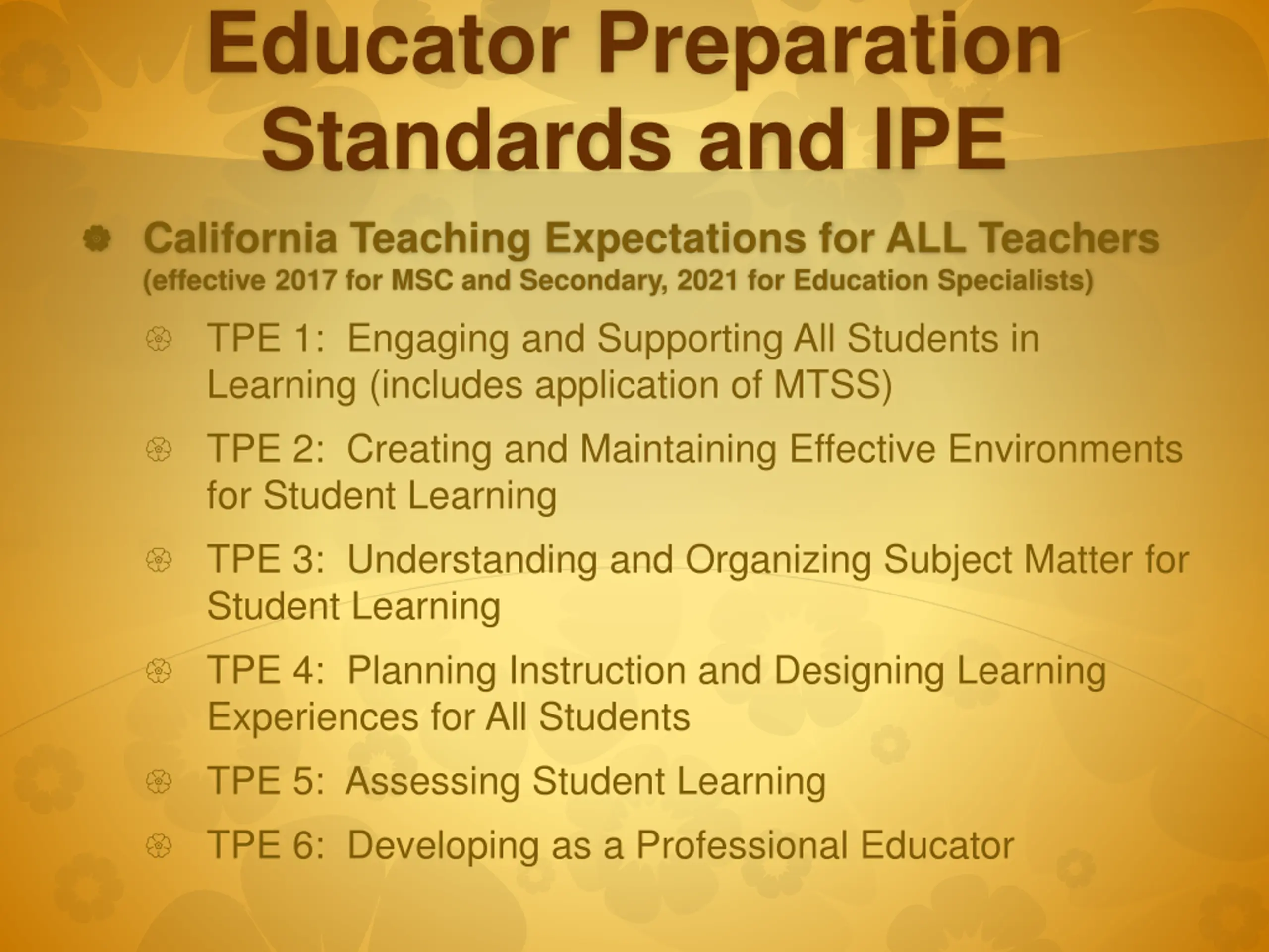 Educator Preparation Standards and IPE California Teaching Expectations for ALL Teachers (effective 2017 for MSC and Secondary, 2021 for Education Specialists) TPE 1: Engaging and Supporting All Students in Learning (includes application of MTSS) TPE 2: Creating and Maintaining Effective Environments for Student Learning TPE 3: Understanding and Organizing Subject Matter for Student Learning TPE 4: Planning Instruction and Designing Learning Experiences for All Students TPE 5: Assessing Student Learning TPE 6: Developing as a Professional Educator