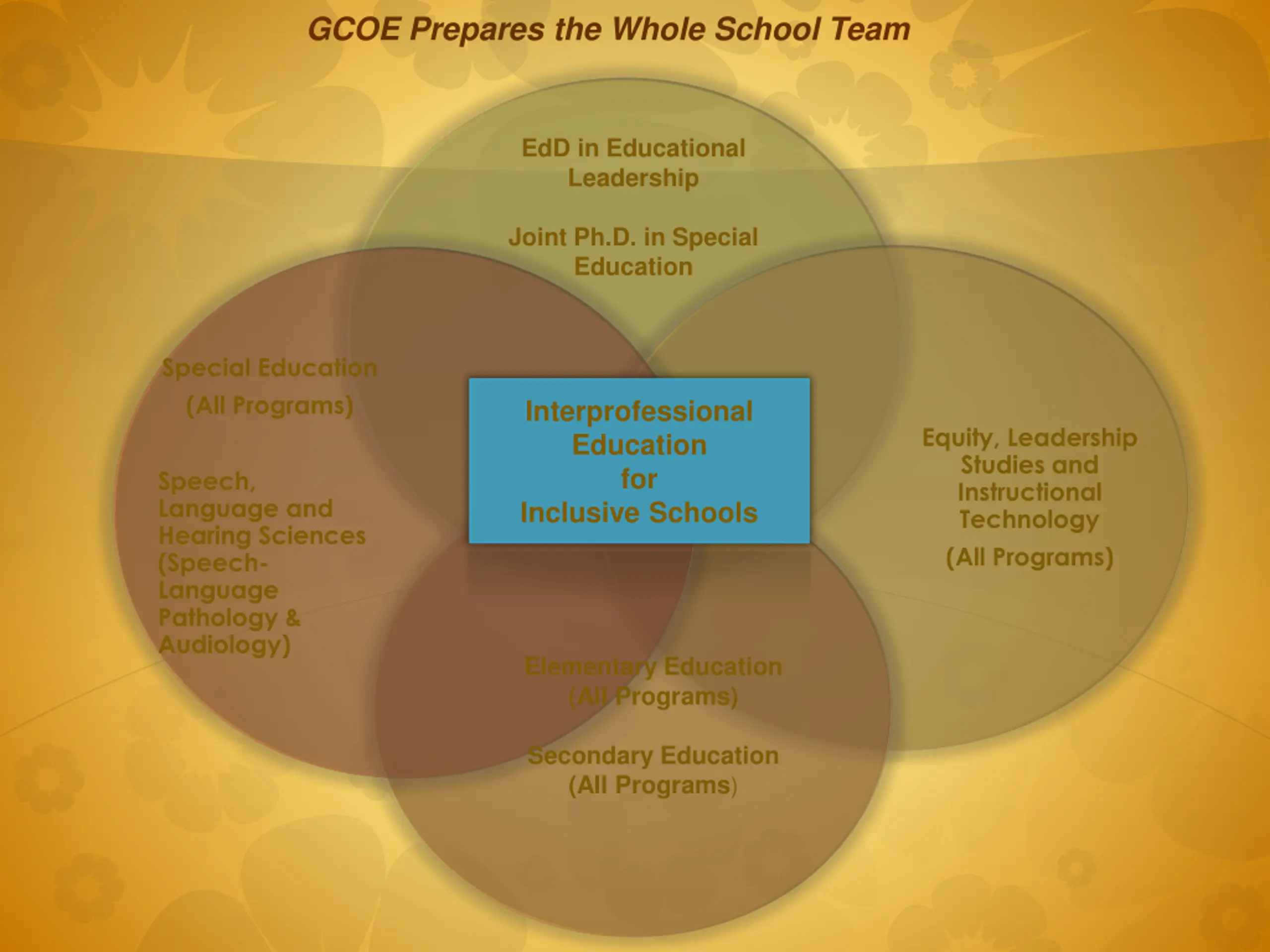 GCOE Prepares the Whole School Team EdD in Educational Leadership Joint Ph.D. in Special Education Special Education (All Programs) Interprofessional Education for Inclusive Schools Equity, Leadership Studies and Instructional Technology (All Programs) Speech, Language and Hearing Sciences (Speech- Language Pathology & Audiology) Elementary Education (All Programs) Secondary Education (All Programs)