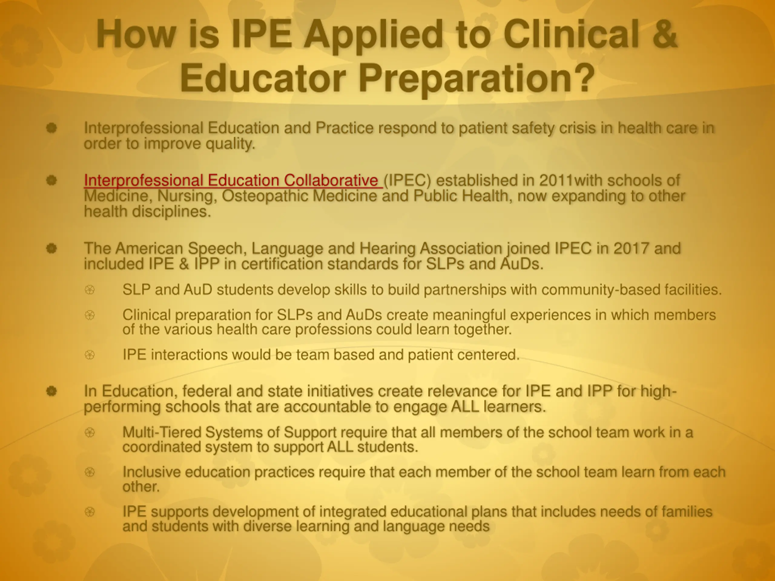 How is IPE Applied to Clinical & Educator Preparation? Interprofessional Education and Practice respond to patient safety crisis in health care in order to improve quality. Interprofessional Education Collaborative (IPEC) established in 2011with schools of Medicine, Nursing, Osteopathic Medicine and Public Health, now expanding to other health disciplines. The American Speech, Language and Hearing Association joined IPEC in 2017 and included IPE & IPP in certification standards for SLPs and AuDs. SLP and AuD students develop skills to build partnerships with community-based facilities. Clinical preparation for SLPs and AuDs create meaningful experiences in which members of the various health care professions could learn together. IPE interactions would be team based and patient centered. In Education, federal and state initiatives create relevance for IPE and IPP for high- performing schools that are accountable to engage ALL learners. Multi-Tiered Systems of Support require that all members of the school team work in a coordinated system to support ALL students. Inclusive education practices require that each member of the school team learn from each other. IPE supports development of integrated educational plans that includes needs of families and students with diverse learning and language needs
