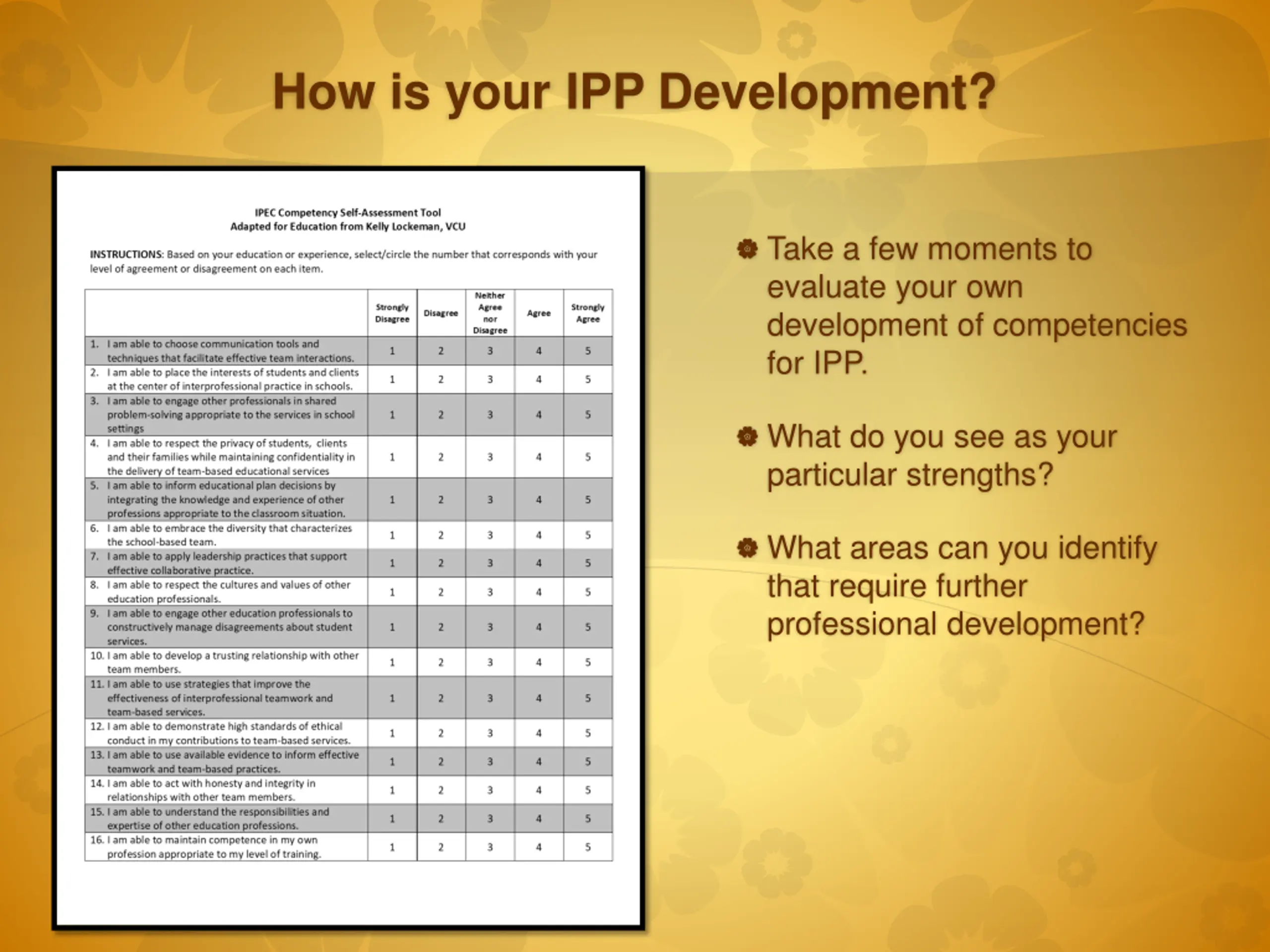 How is your IPP Development? Take a few moments to evaluate your own development of competencies for IPP. What do you see as your particular strengths? What areas can you identify that require further professional development?