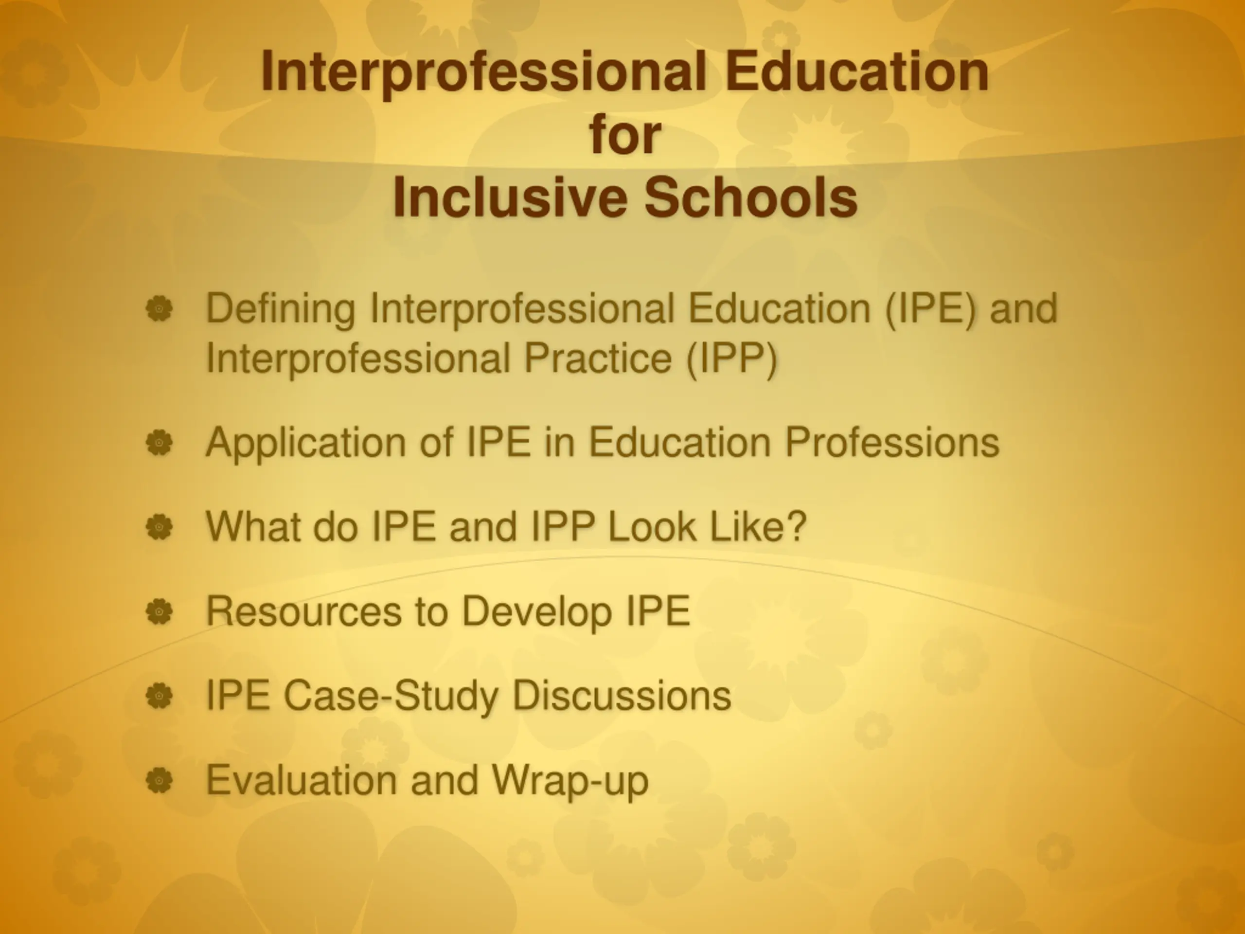 Interprofessional Education for Inclusive Schools Defining Interprofessional Education (IPE) and Interprofessional Practice (IPP) Application of IPE in Education Professions What do IPE and IPP Look Like? Resources to Develop IPE IPE Case-Study Discussions Evaluation and Wrap-up