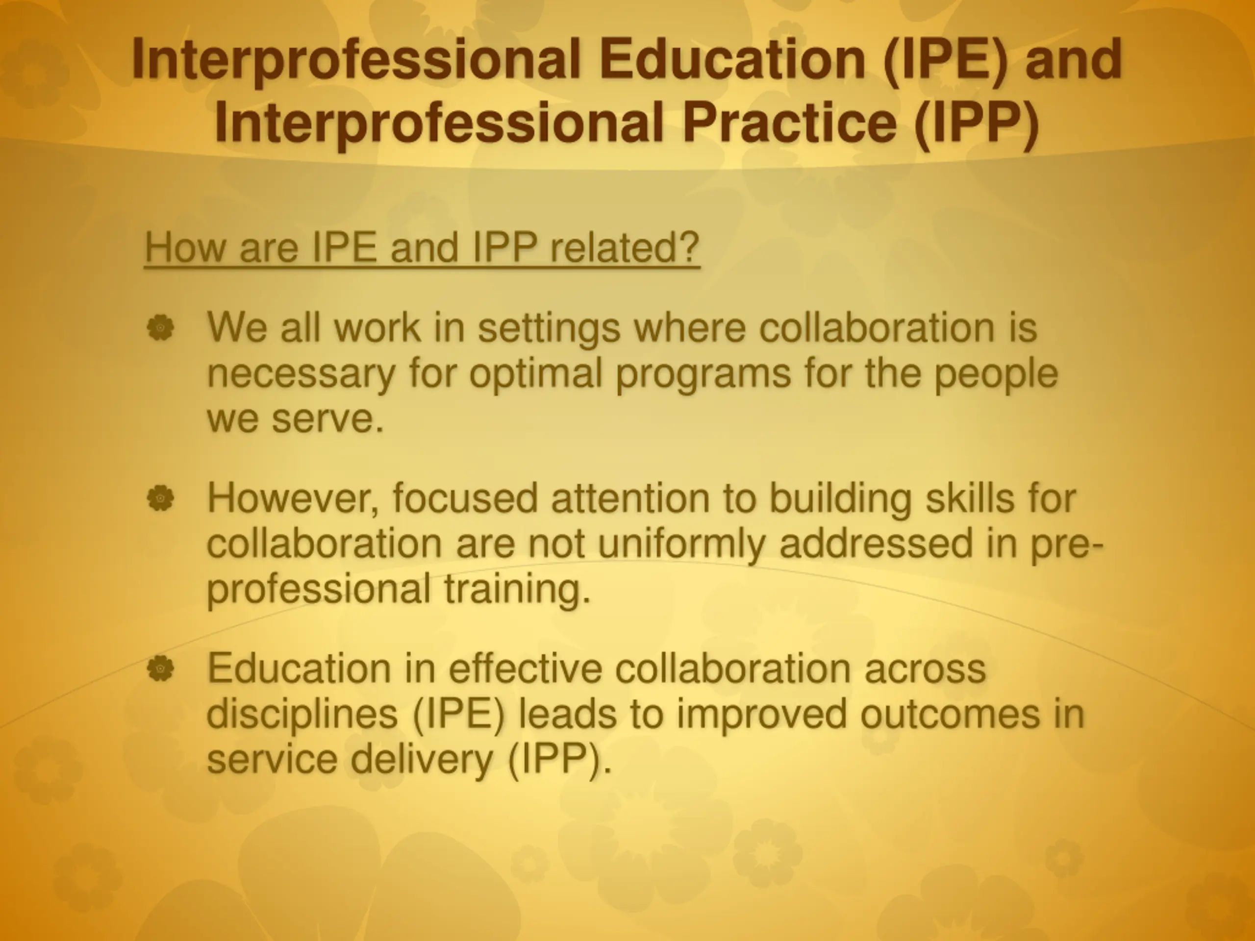 Interprofessional Education (IPE) and Interprofessional Practice (IPP) How are IPE and IPP related? We all work in settings where collaboration is necessary for optimal programs for the people we serve. However, focused attention to building skills for collaboration are not uniformly addressed in pre- professional training. Education in effective collaboration across disciplines (IPE) leads to improved outcomes in service delivery (IPP).