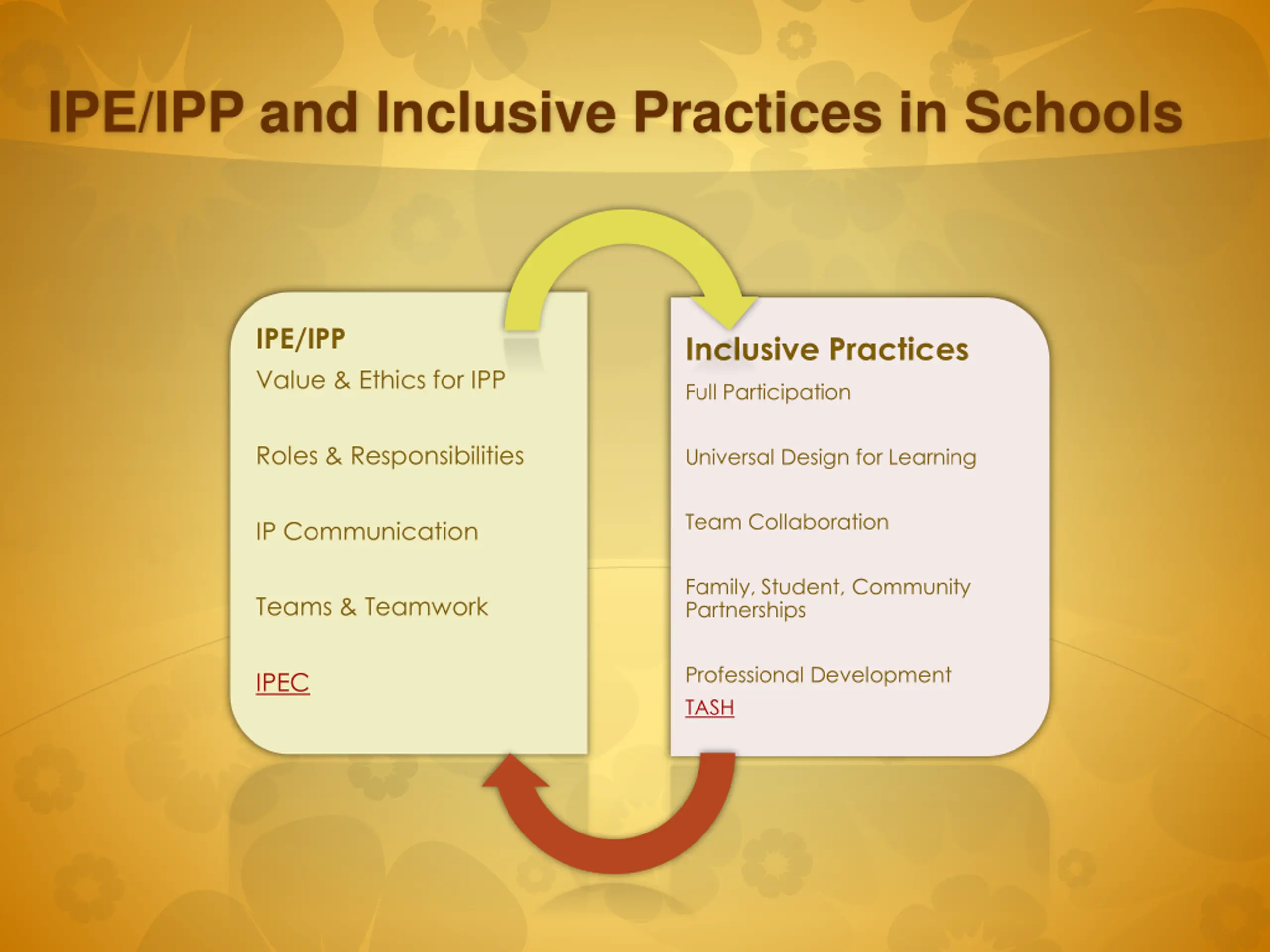IPE/IPP and Inclusive Practices in Schools IPE/IPP Value & Ethics for IPP Inclusive Practices Full Participation Roles & Responsibilities Universal Design for Learning Team Collaboration IP Communication Family, Student, Community Partnerships Teams & Teamwork Professional Development IPEC IPEC TASH TASH