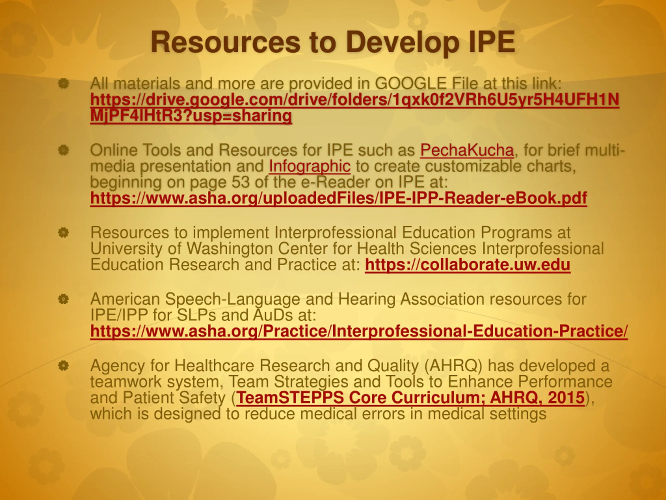 Resources to Develop IPE All materials and more are provided in GOOGLE File at this link: https://drive.google.com/drive/folders/1qxk0f2VRh6U5yr5H4UFH1N MjPF4lHtR3?usp=sharing Online Tools and Resources for IPE such as PechaKucha, for brief multi- media presentation and Infographic to create customizable charts, beginning on page 53 of the e-Reader on IPE at: https://www.asha.org/uploadedFiles/IPE-IPP-Reader-eBook.pdf Resources to implement Interprofessional Education Programs at University of Washington Center for Health Sciences Interprofessional Education Research and Practice at: https://collaborate.uw.edu American Speech-Language and Hearing Association resources for IPE/IPP for SLPs and AuDs at: https://www.asha.org/Practice/Interprofessional-Education-Practice/ Agency for Healthcare Research and Quality (AHRQ) has developed a teamwork system, Team Strategies and Tools to Enhance Performance and Patient Safety (TeamSTEPPS Core Curriculum; AHRQ, 2015), which is designed to reduce medical errors in medical settings