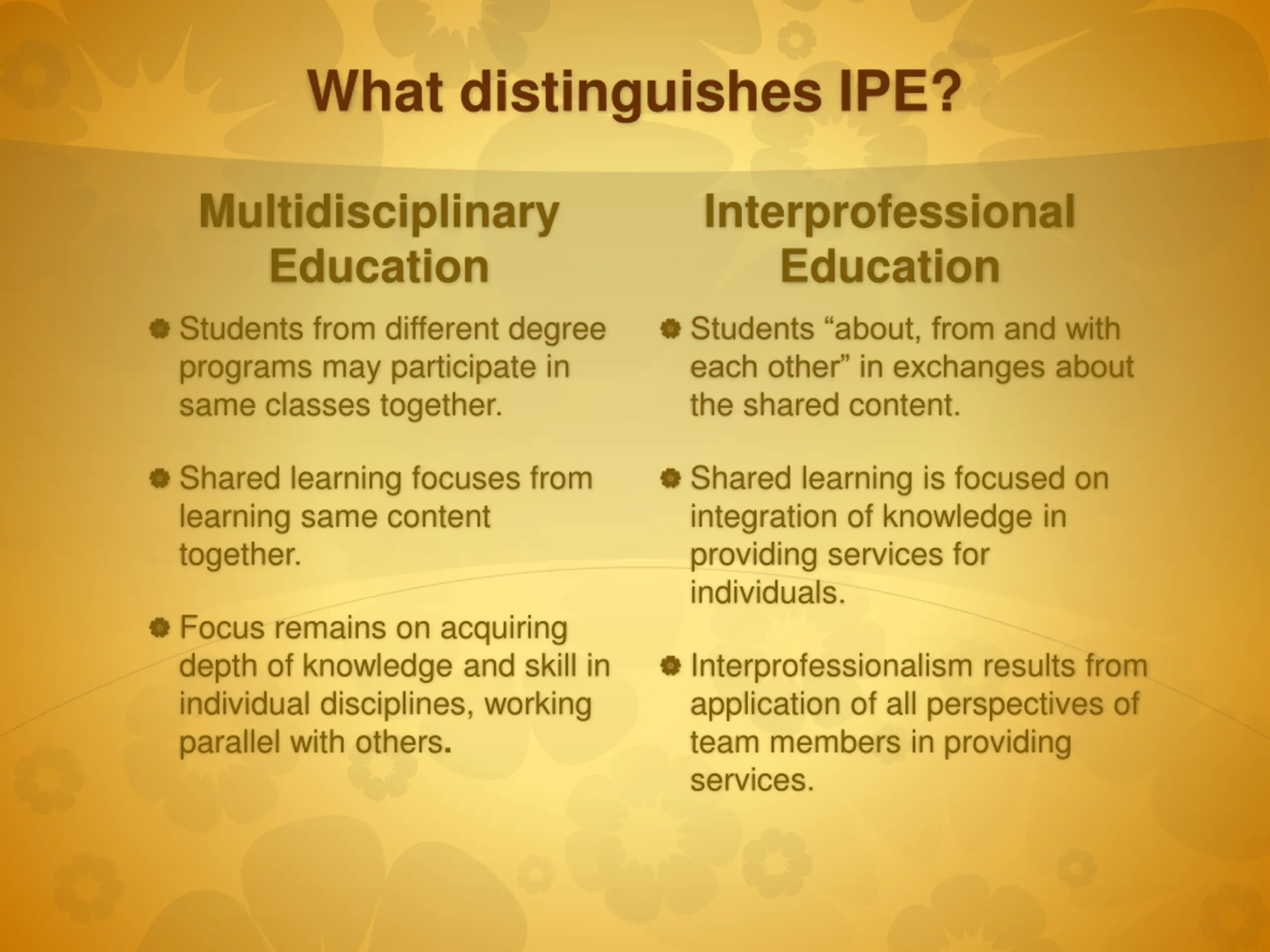 What distinguishes IPE? Multidisciplinary Education Interprofessional Education Students from different degree programs may participate in same classes together. Students about, from and with each other in exchanges about the shared content. Shared learning focuses from learning same content together. Shared learning is focused on integration of knowledge in providing services for individuals. Focus remains on acquiring depth of knowledge and skill in individual disciplines, working parallel with others. Interprofessionalism results from application of all perspectives of team members in providing services.