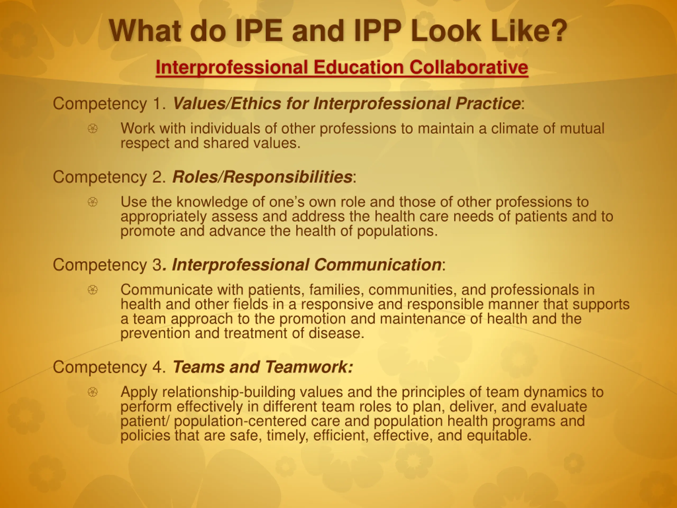 What do IPE and IPP Look Like? Interprofessional Education Collaborative Competency 1. Values/Ethics for Interprofessional Practice: Work with individuals of other professions to maintain a climate of mutual respect and shared values. Competency 2. Roles/Responsibilities: Use the knowledge of one s own role and those of other professions to appropriately assess and address the health care needs of patients and to promote and advance the health of populations. Competency 3. Interprofessional Communication: Communicate with patients, families, communities, and professionals in health and other fields in a responsive and responsible manner that supports a team approach to the promotion and maintenance of health and the prevention and treatment of disease. Competency 4. Teams and Teamwork: Apply relationship-building values and the principles of team dynamics to perform effectively in different team roles to plan, deliver, and evaluate patient/ population-centered care and population health programs and policies that are safe, timely, efficient, effective, and equitable.
