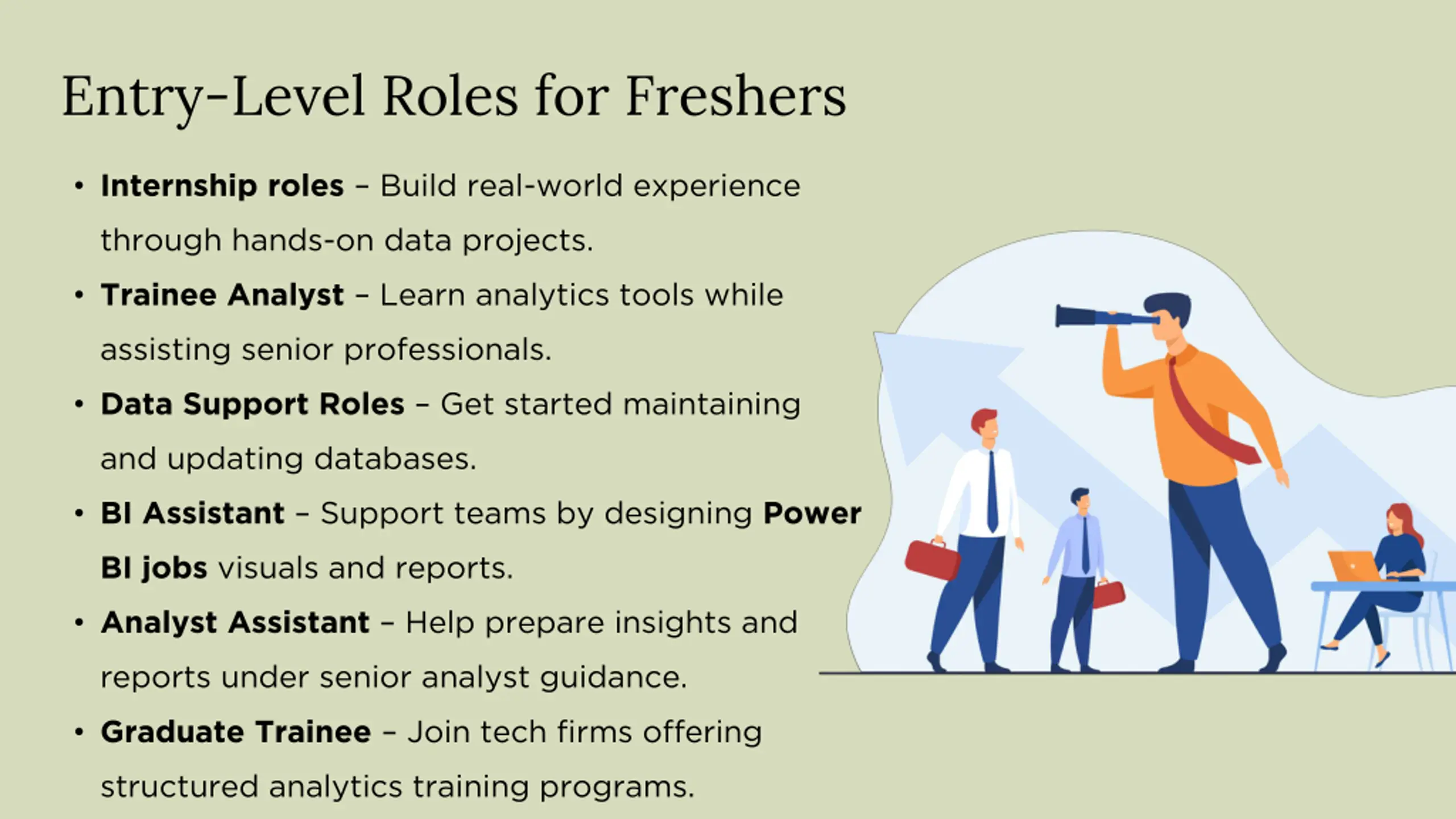 Entry-Level Roles for Freshers Internship roles Build real-world experience through hands-on data projects. Trainee Analyst Learn analytics tools while assisting senior professionals. Data Support Roles Get started maintaining and updating databases. BI Assistant Support teams by designing Power BI jobs visuals and reports. Analyst Assistant Help prepare insights and reports under senior analyst guidance. Graduate Trainee Join tech firms offering structured analytics training programs.