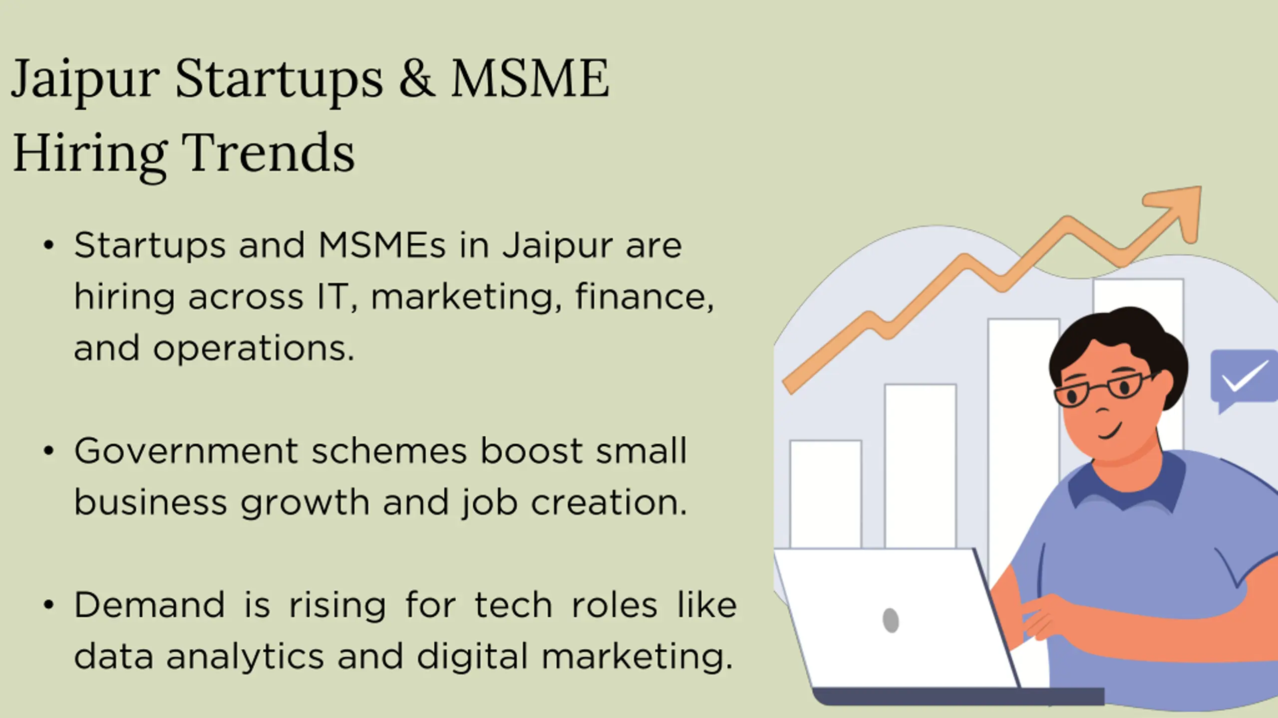 Jaipur Startups & MSME Hiring Trends Startups and MSMEs in Jaipur are hiring across IT, marketing, finance, and operations. Government schemes boost small business growth and job creation. Demand is rising for tech roles like data analytics and digital marketing.