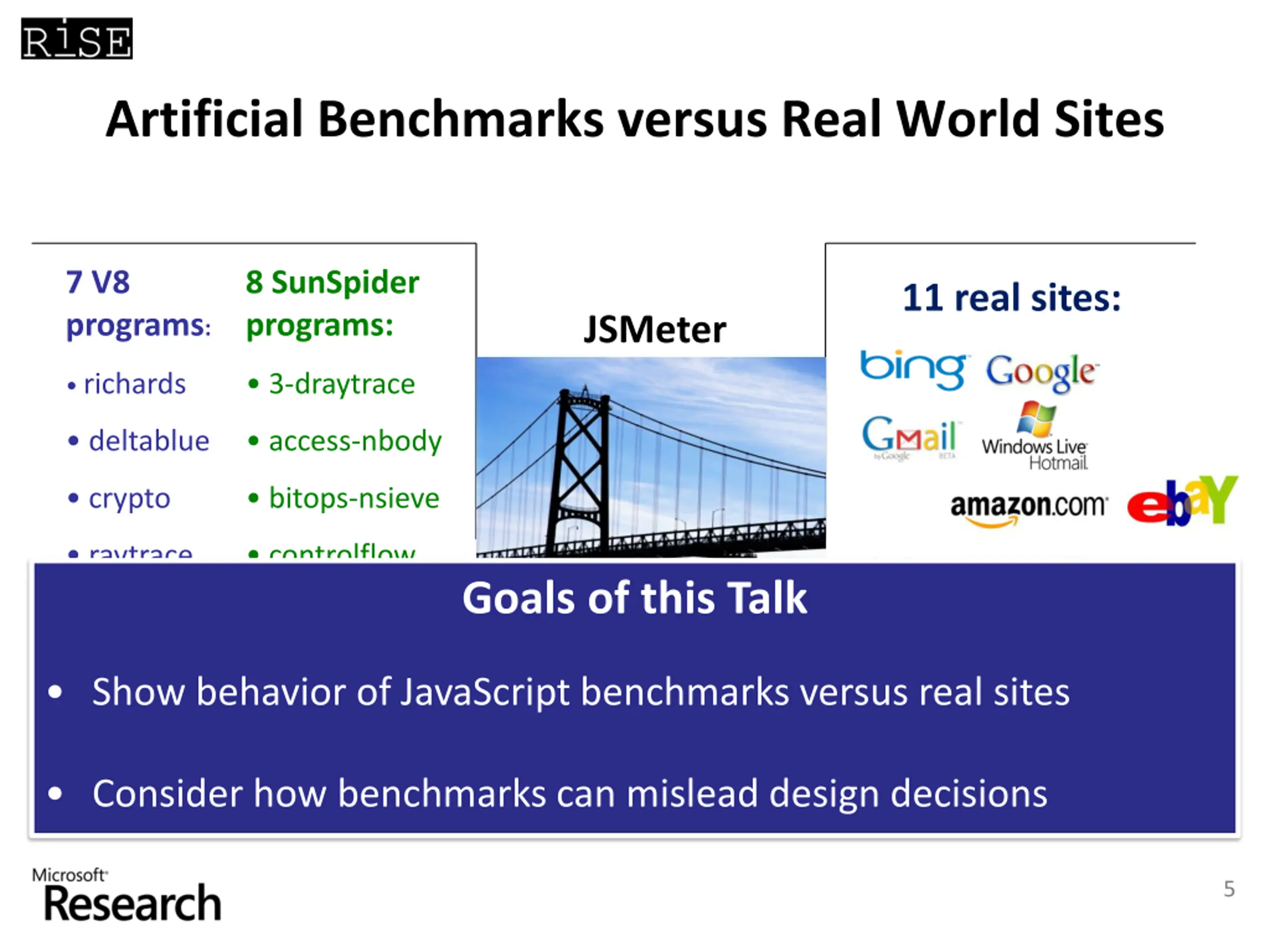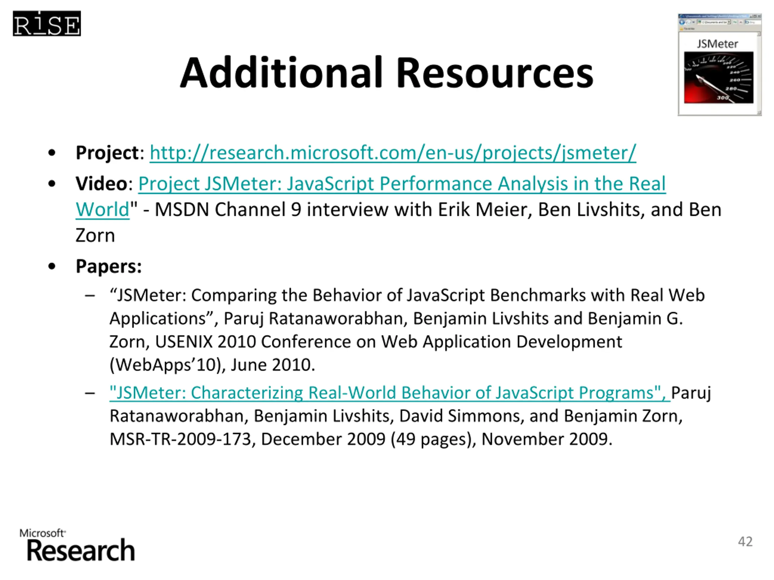 Additional Resources Project: http://research.microsoft.com/en-us/projects/jsmeter/ Video: Project JSMeter: JavaScript Performance Analysis in the Real World" - MSDN Channel 9 interview with Erik Meier, Ben Livshits, and Ben Zorn Papers: JSMeter: Comparing the Behavior of JavaScript Benchmarks with Real Web Applications , Paruj Ratanaworabhan, Benjamin Livshits and Benjamin G. Zorn, USENIX 2010 Conference on Web Application Development (WebApps 10), June 2010. "JSMeter: Characterizing Real-World Behavior of JavaScript Programs", Paruj Ratanaworabhan, Benjamin Livshits, David Simmons, and Benjamin Zorn, MSR-TR-2009-173, December 2009 (49 pages), November 2009. 42