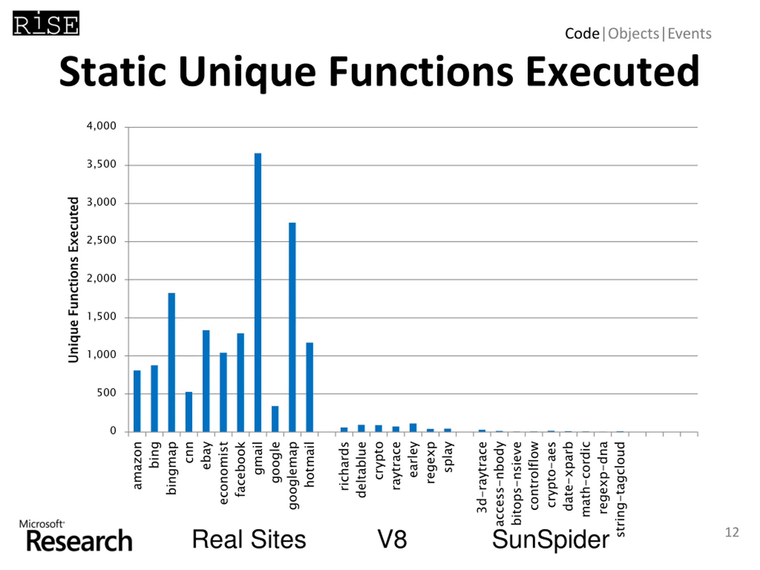 Code|Objects|Events Static Unique Functions Executed 4,000 3,500 3,000 Unique Functions Executed Unique Functions Executed 2,500 2,000 1,500 1,000 500 0 amazon bingmap crypto facebook access-nbody gmail bing ebay regexp googlemap deltablue date-xparb regexp-dna cnn raytrace splay string-tagcloud bitops-nsieve crypto-aes richards 3d-raytrace economist hotmail earley google controlflow math-cordic Real Sites V8 SunSpider 12