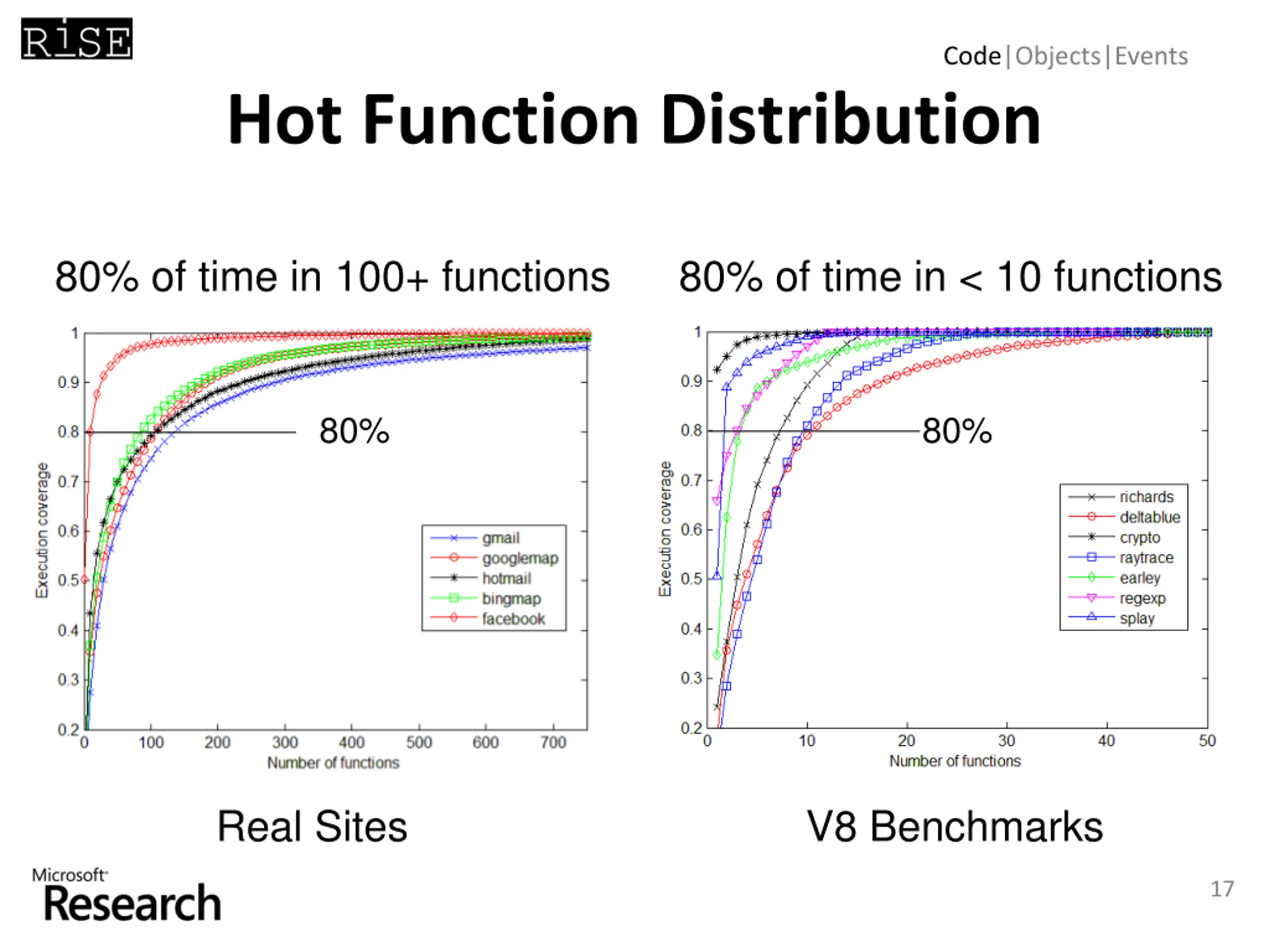 Code|Objects|Events Hot Function Distribution 80% of time in 100+ functions 80% of time in < 10 functions 80% 80% Real Sites V8 Benchmarks 17