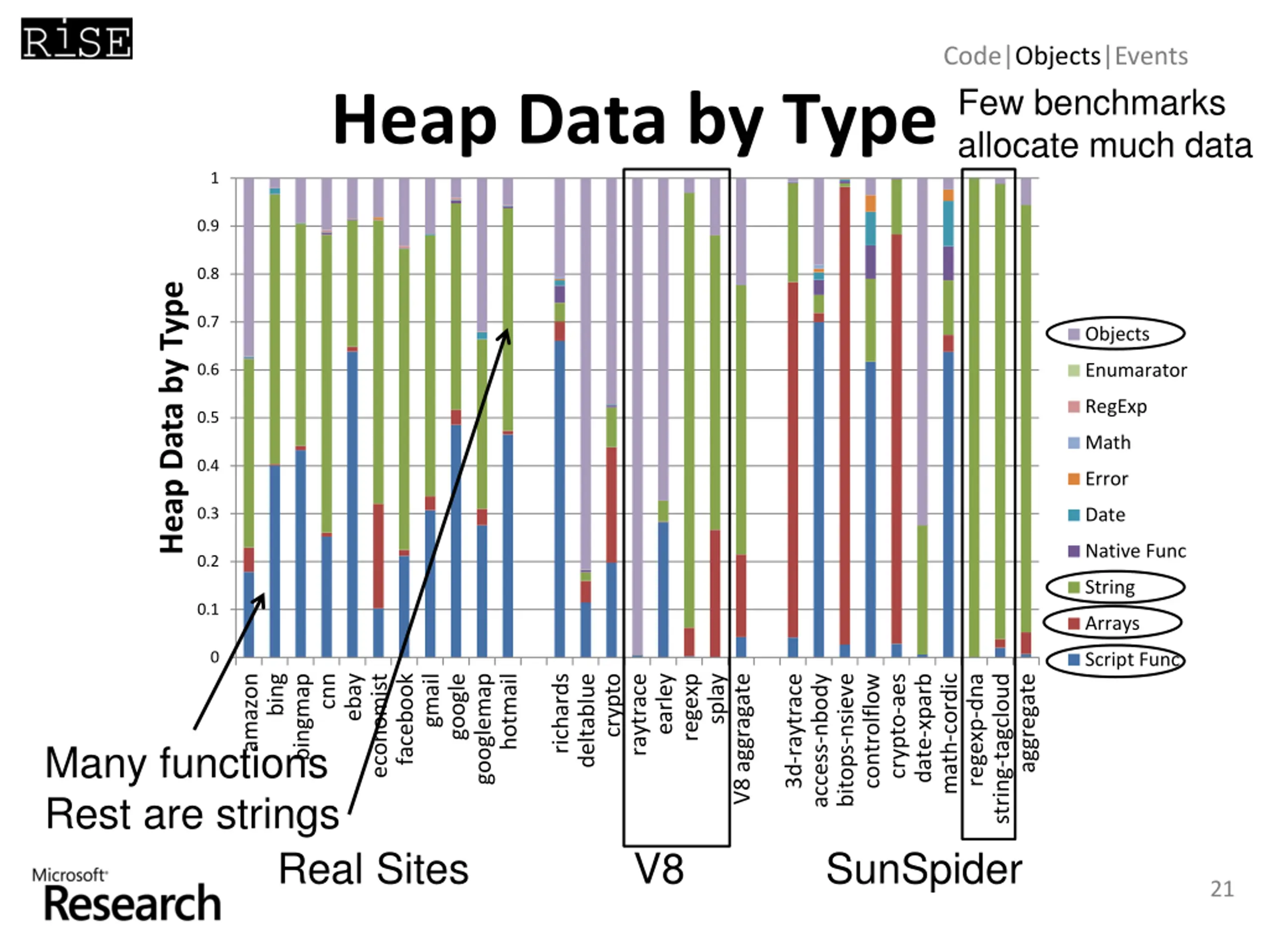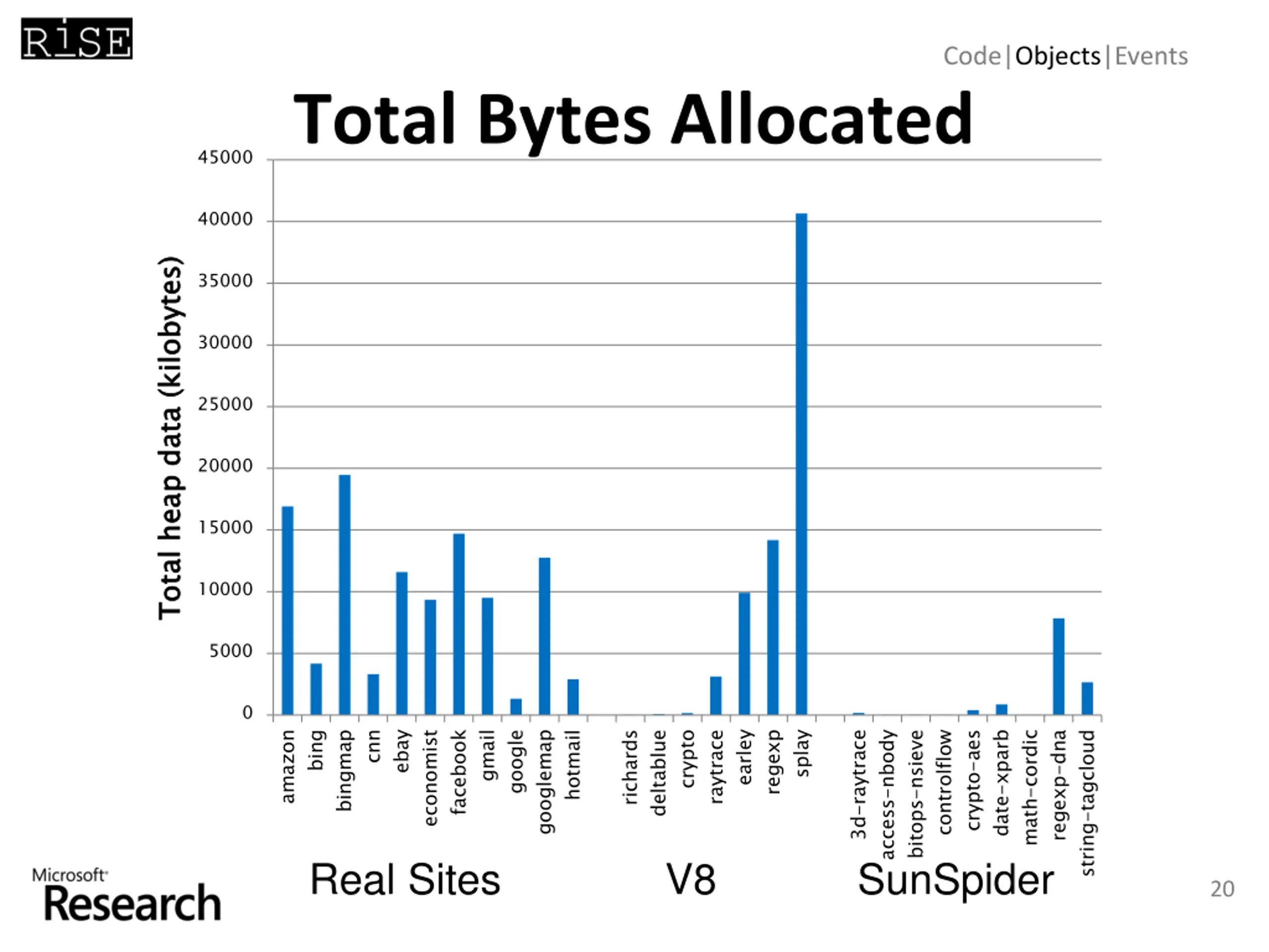 Code|Objects|Events Total Bytes Allocated 45000 40000 Total heap data (kilobytes) Total heap data (kilobytes) 35000 30000 25000 20000 15000 10000 5000 0 amazon earley access-nbody cnn facebook richards splay string-tagcloud 3d-raytrace bing gmail googlemap date-xparb regexp bitops-nsieve crypto bingmap google hotmail deltablue ebay controlflow economist crypto-aes regexp-dna math-cordic raytrace Real Sites V8 SunSpider 20