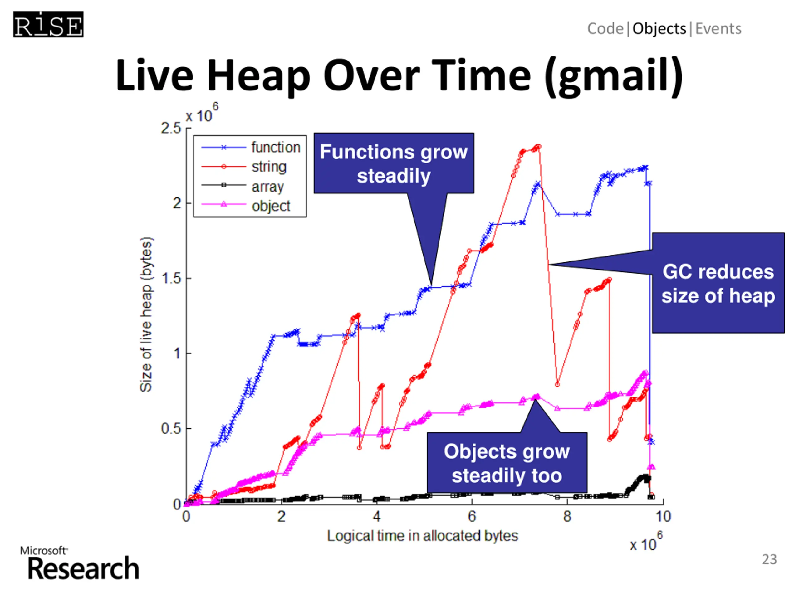 Code|Objects|Events Live Heap Over Time (gmail) Functions grow steadily GC reduces size of heap Objects grow steadily too 23