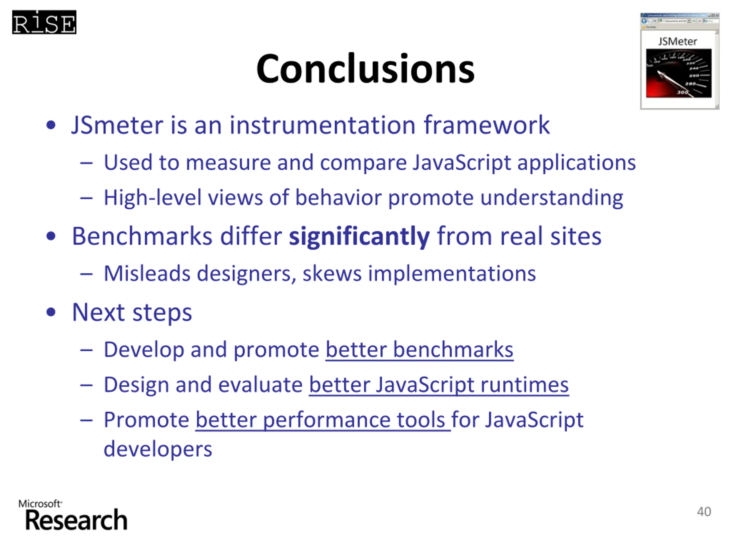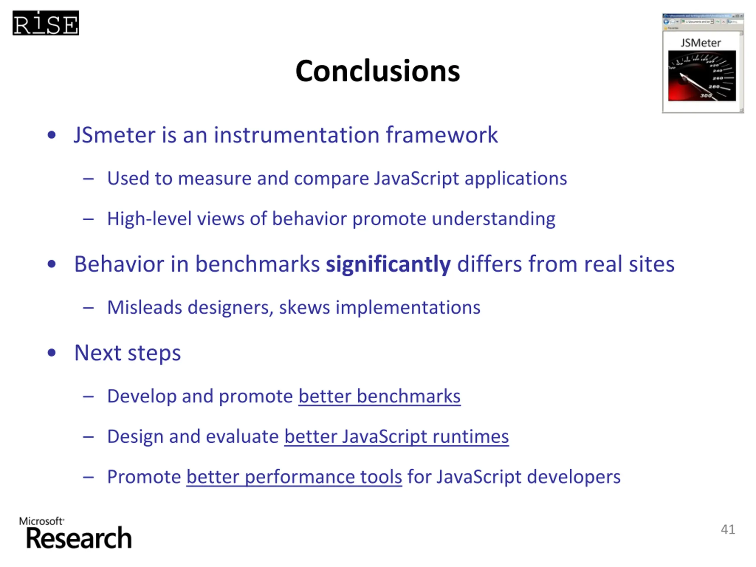 Conclusions JSmeter is an instrumentation framework Used to measure and compare JavaScript applications High-level views of behavior promote understanding Benchmarks differ significantly from real sites Misleads designers, skews implementations Next steps Develop and promote better benchmarks Design and evaluate better JavaScript runtimes Promote better performance tools for JavaScript developers 40