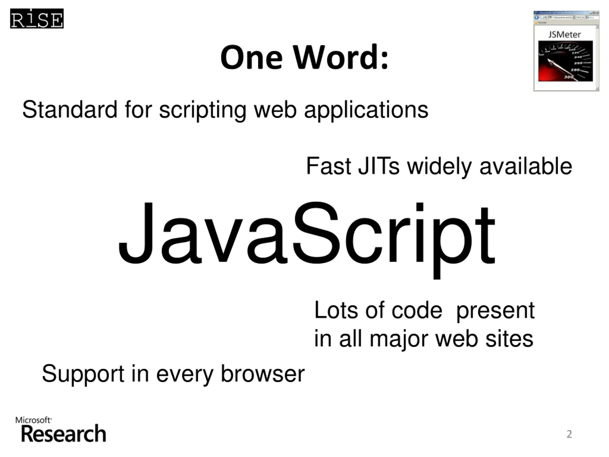One Word: Standard for scripting web applications Fast JITs widely available JavaScript Lots of code present in all major web sites Support in every browser 2