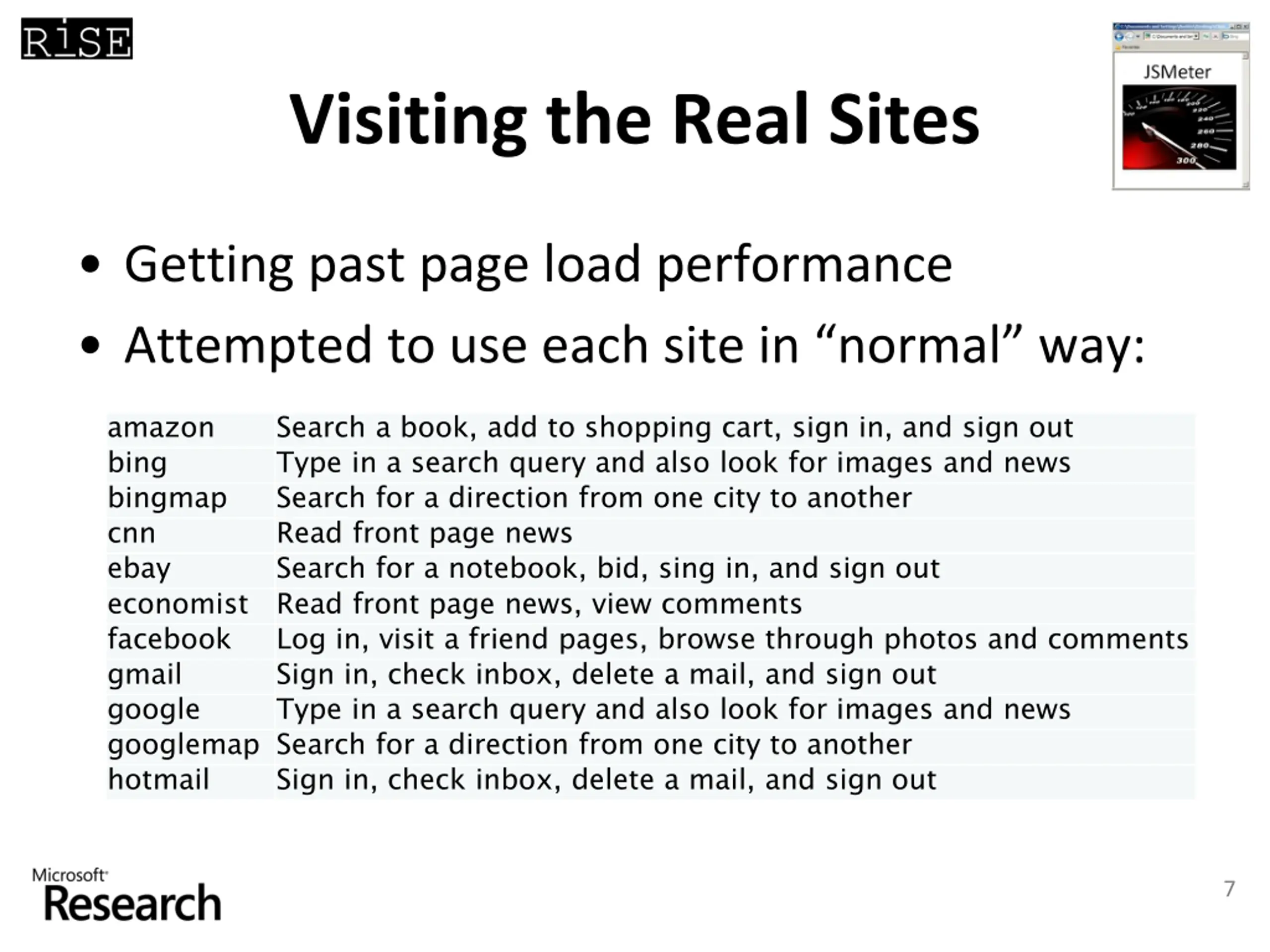 Visiting the Real Sites Getting past page load performance Attempted to use each site in normal way: amazon bing bingmap cnn ebay economist facebook gmail google googlemap Search for a direction from one city to another hotmail Search a book, add to shopping cart, sign in, and sign out Type in a search query and also look for images and news Search for a direction from one city to another Read front page news Search for a notebook, bid, sing in, and sign out Read front page news, view comments Log in, visit a friend pages, browse through photos and comments Sign in, check inbox, delete a mail, and sign out Type in a search query and also look for images and news Sign in, check inbox, delete a mail, and sign out 7