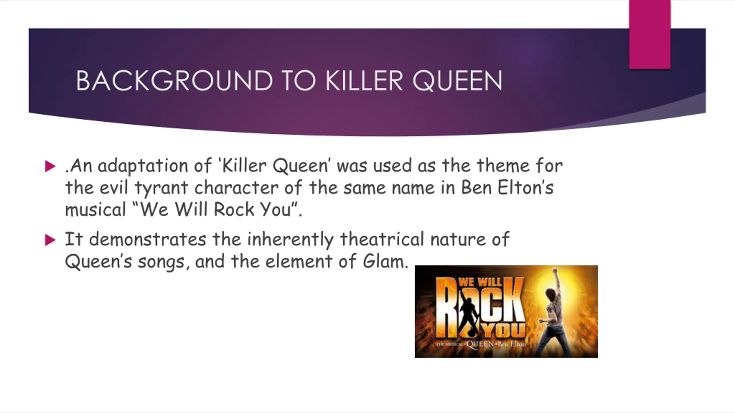 BACKGROUND TO KILLER QUEEN .An adaptation of Killer Queen was used as the theme for the evil tyrant character of the same name in Ben Elton s musical We Will Rock You . It demonstrates the inherently theatrical nature of Queen s songs, and the element of Glam.