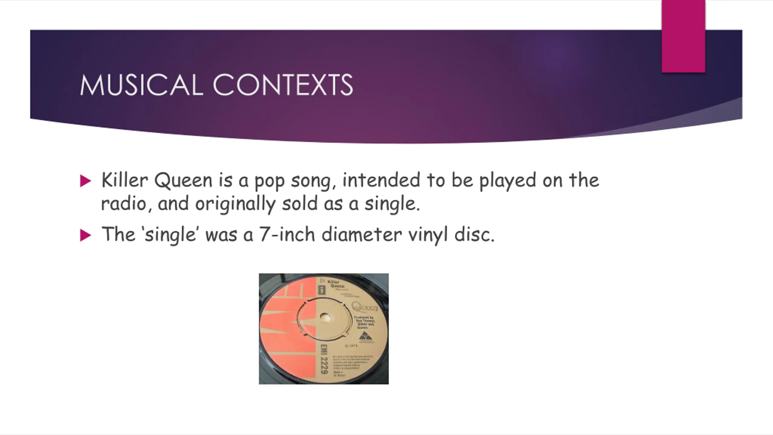 MUSICAL CONTEXTS Killer Queen is a pop song, intended to be played on the radio, and originally sold as a single. The single was a 7-inch diameter vinyl disc.