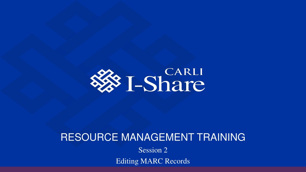 Dive into session 2 of the Resource Management Training focusing on editing MARC records. Learn about session logistics, key learning outcomes, managing bibliographic records in Alma, accessing the Metadata Editor, and navigating its features efficiently.