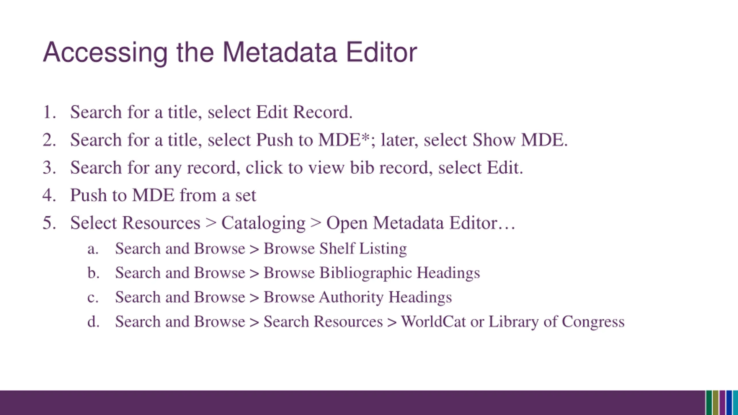 Accessing the Metadata Editor 1. Search for a title, select Edit Record. 2. Search for a title, select Push to MDE*; later, select Show MDE. 3. Search for any record, click to view bib record, select Edit. 4. Push to MDE from a set 5. Select Resources > Cataloging > Open Metadata Editor a. Search and Browse > Browse Shelf Listing b. Search and Browse > Browse Bibliographic Headings c. Search and Browse > Browse Authority Headings d. Search and Browse > Search Resources > WorldCat or Library of Congress