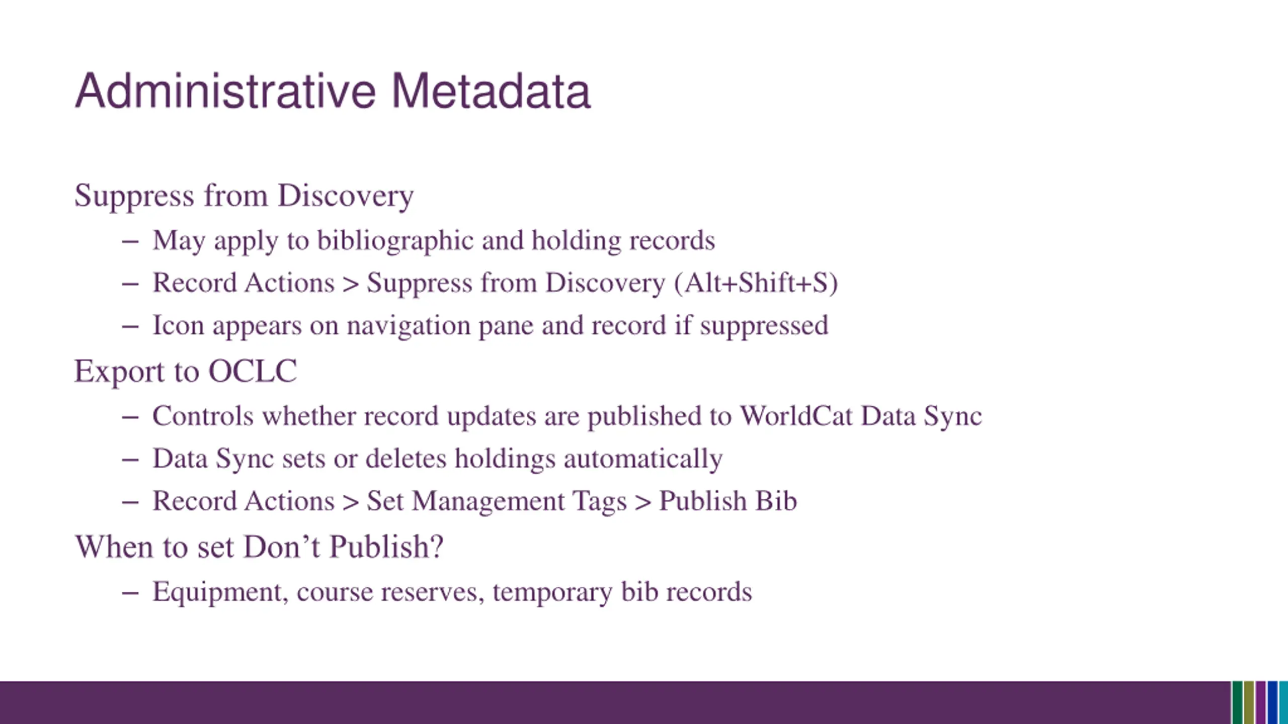 Administrative Metadata Suppress from Discovery May apply to bibliographic and holding records Record Actions > Suppress from Discovery (Alt+Shift+S) Icon appears on navigation pane and record if suppressed Export to OCLC Controls whether record updates are published to WorldCat Data Sync Data Sync sets or deletes holdings automatically Record Actions > Set Management Tags > Publish Bib When to set Don t Publish? Equipment, course reserves, temporary bib records