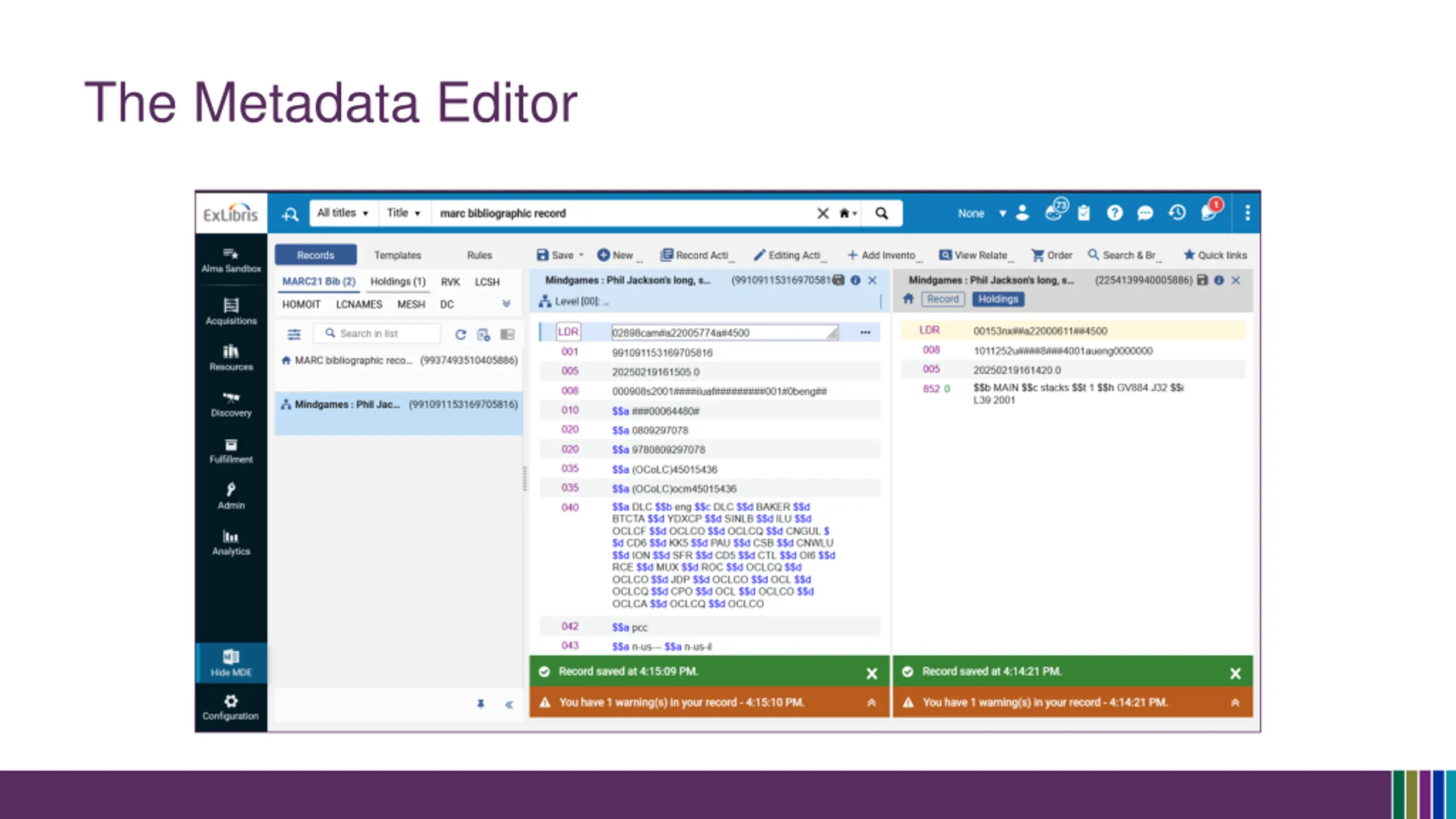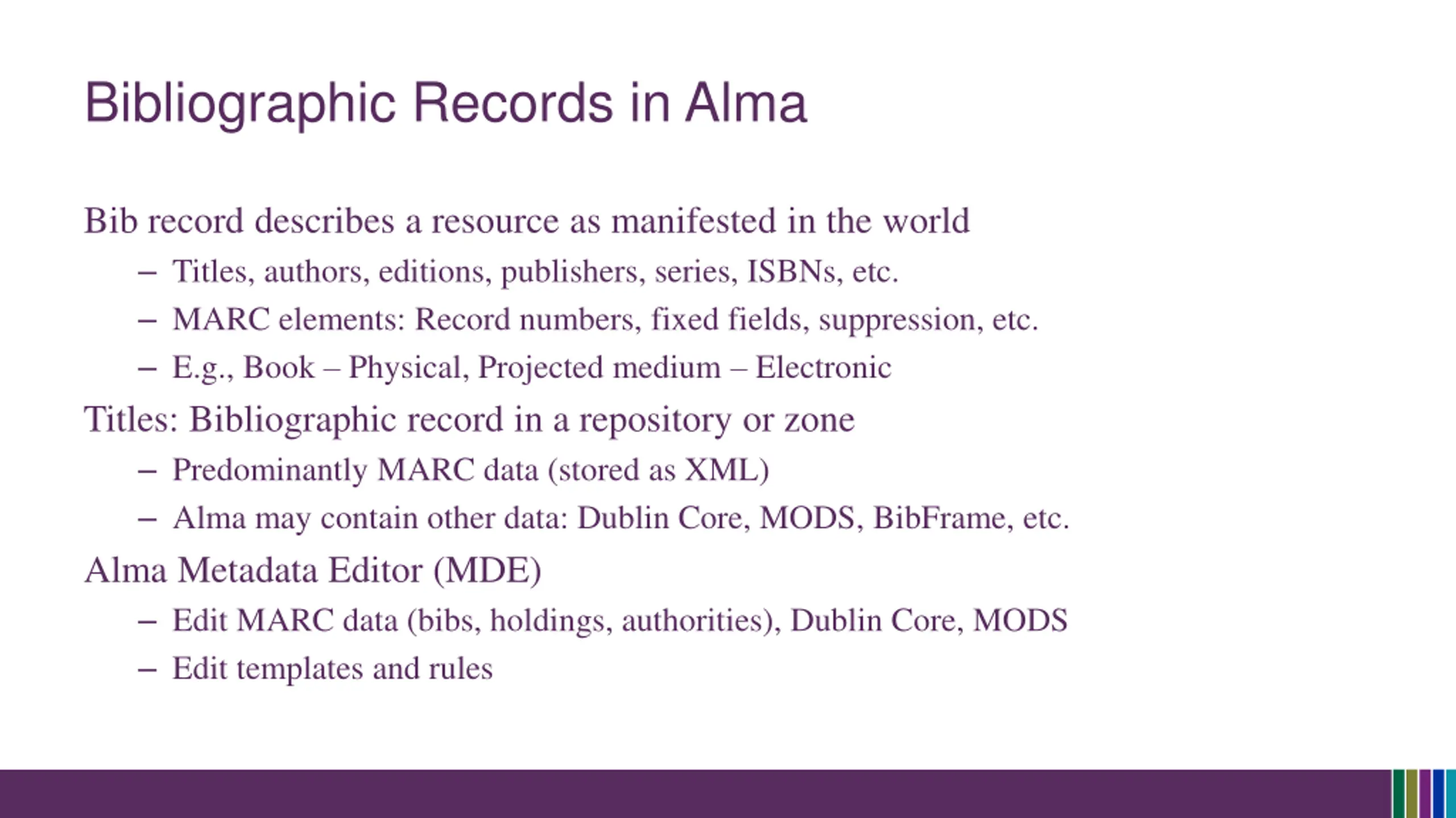 Bibliographic Records in Alma Bib record describes a resource as manifested in the world Titles, authors, editions, publishers, series, ISBNs, etc. MARC elements: Record numbers, fixed fields, suppression, etc. E.g., Book Physical, Projected medium Electronic Titles: Bibliographic record in a repository or zone Predominantly MARC data (stored as XML) Alma may contain other data: Dublin Core, MODS, BibFrame, etc. Alma Metadata Editor (MDE) Edit MARC data (bibs, holdings, authorities), Dublin Core, MODS Edit templates and rules