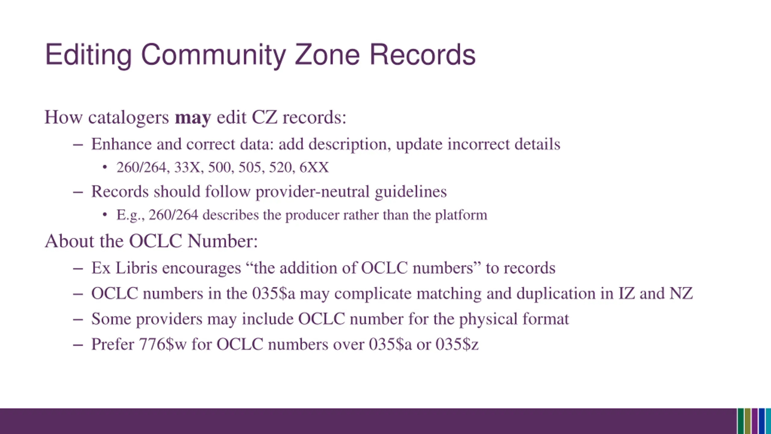 Editing Community Zone Records How catalogers may edit CZ records: Enhance and correct data: add description, update incorrect details 260/264, 33X, 500, 505, 520, 6XX Records should follow provider-neutral guidelines E.g., 260/264 describes the producer rather than the platform About the OCLC Number: Ex Libris encourages the addition of OCLC numbers to records OCLC numbers in the 035$a may complicate matching and duplication in IZ and NZ Some providers may include OCLC number for the physical format Prefer 776$w for OCLC numbers over 035$a or 035$z