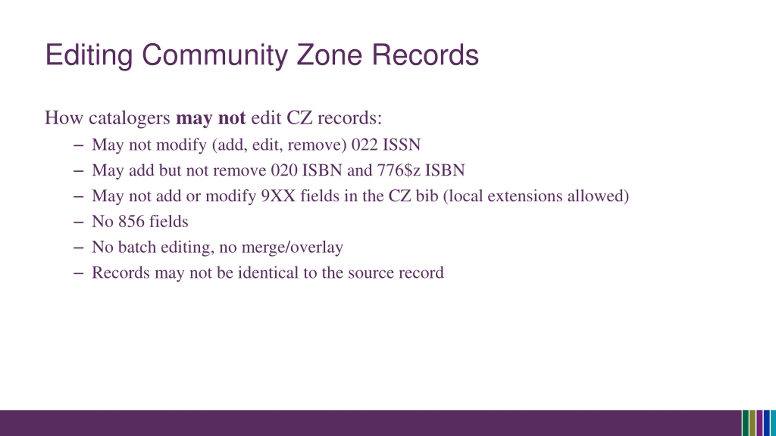 Editing Community Zone Records How catalogers may not edit CZ records: May not modify (add, edit, remove) 022 ISSN May add but not remove 020 ISBN and 776$z ISBN May not add or modify 9XX fields in the CZ bib (local extensions allowed) No 856 fields No batch editing, no merge/overlay Records may not be identical to the source record