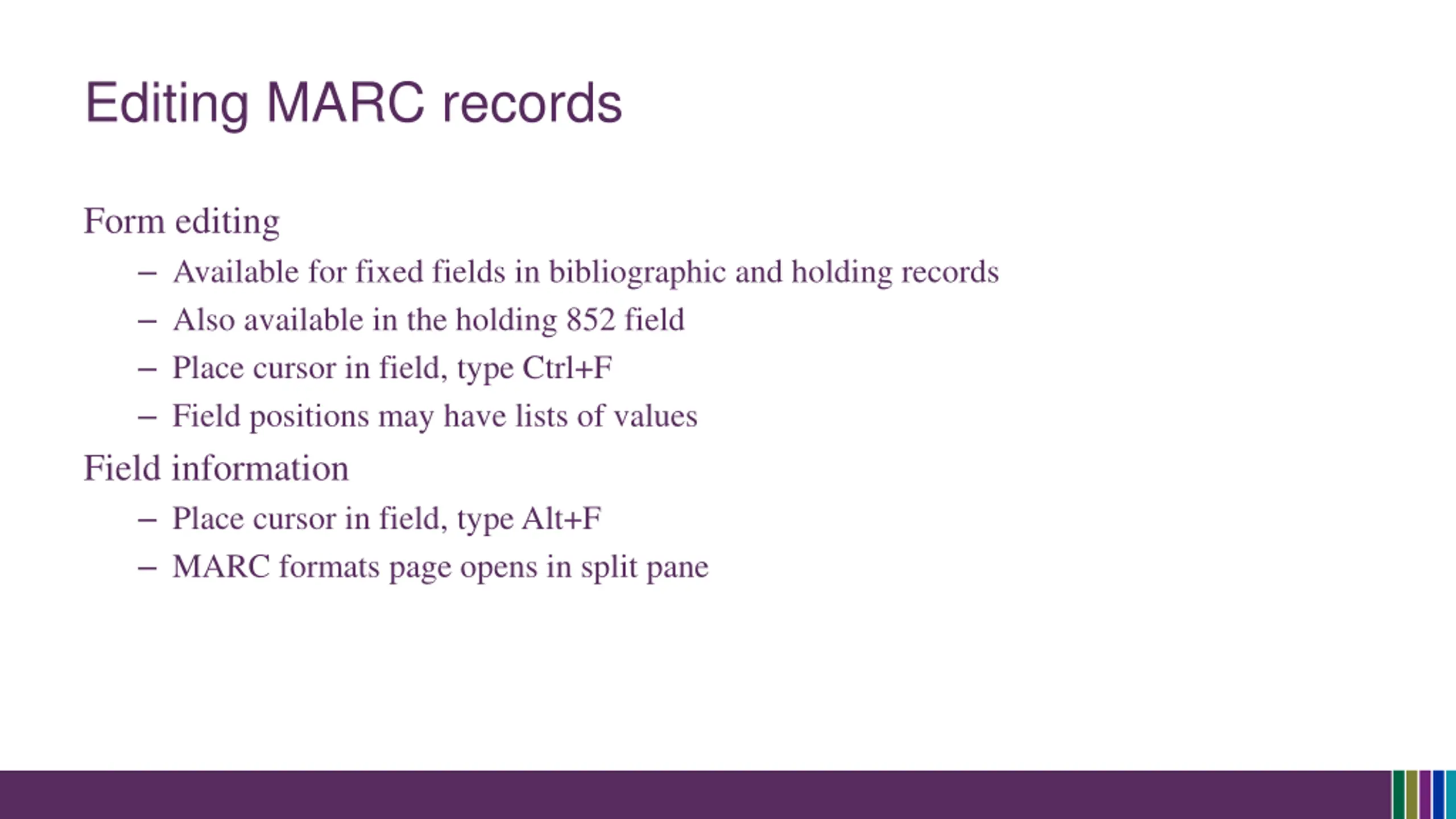 Editing MARC records Form editing Available for fixed fields in bibliographic and holding records Also available in the holding 852 field Place cursor in field, type Ctrl+F Field positions may have lists of values Field information Place cursor in field, type Alt+F MARC formats page opens in split pane