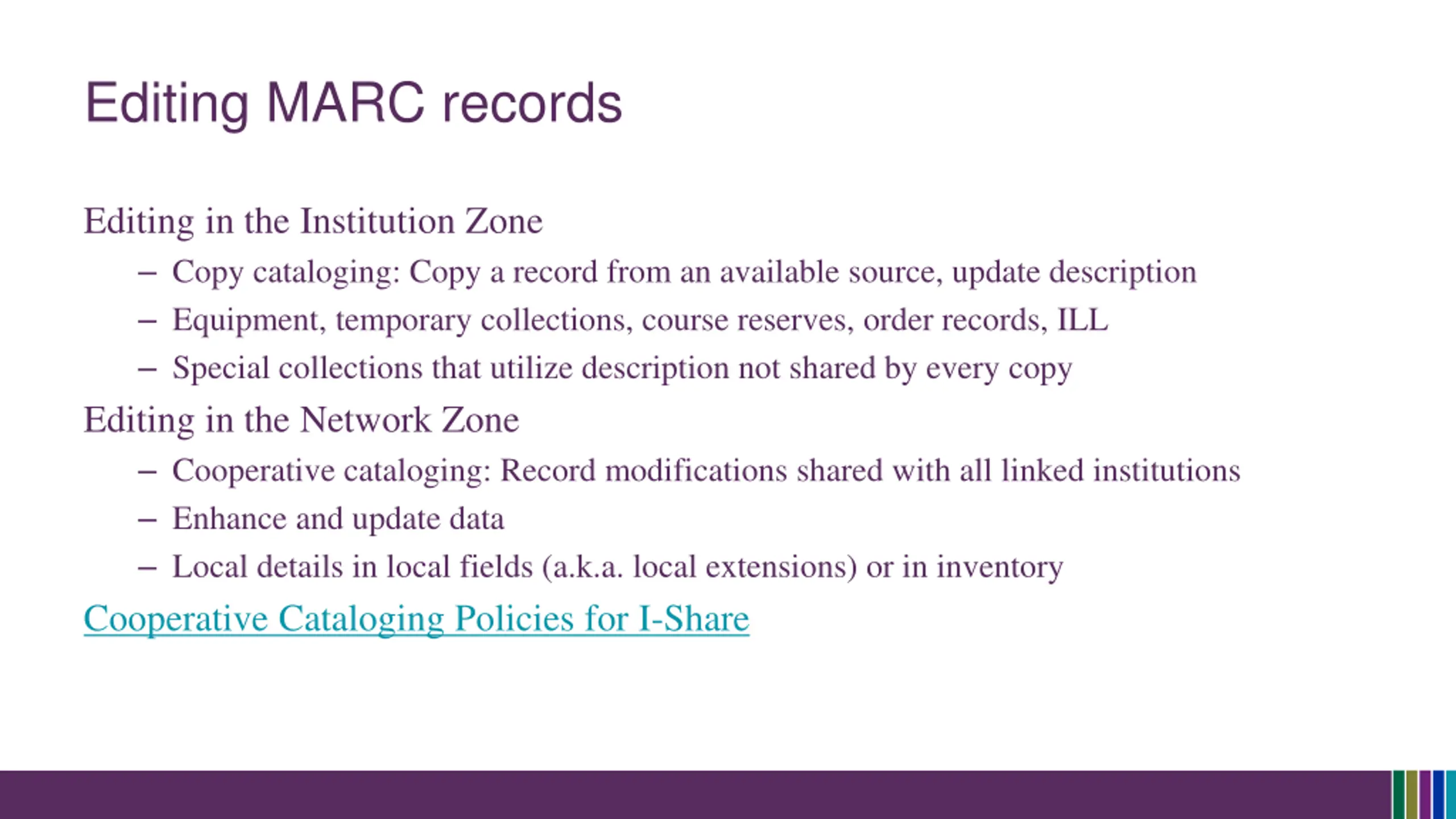 Editing MARC records Editing in the Institution Zone Copy cataloging: Copy a record from an available source, update description Equipment, temporary collections, course reserves, order records, ILL Special collections that utilize description not shared by every copy Editing in the Network Zone Cooperative cataloging: Record modifications shared with all linked institutions Enhance and update data Local details in local fields (a.k.a. local extensions) or in inventory Cooperative Cataloging Policies for I-Share
