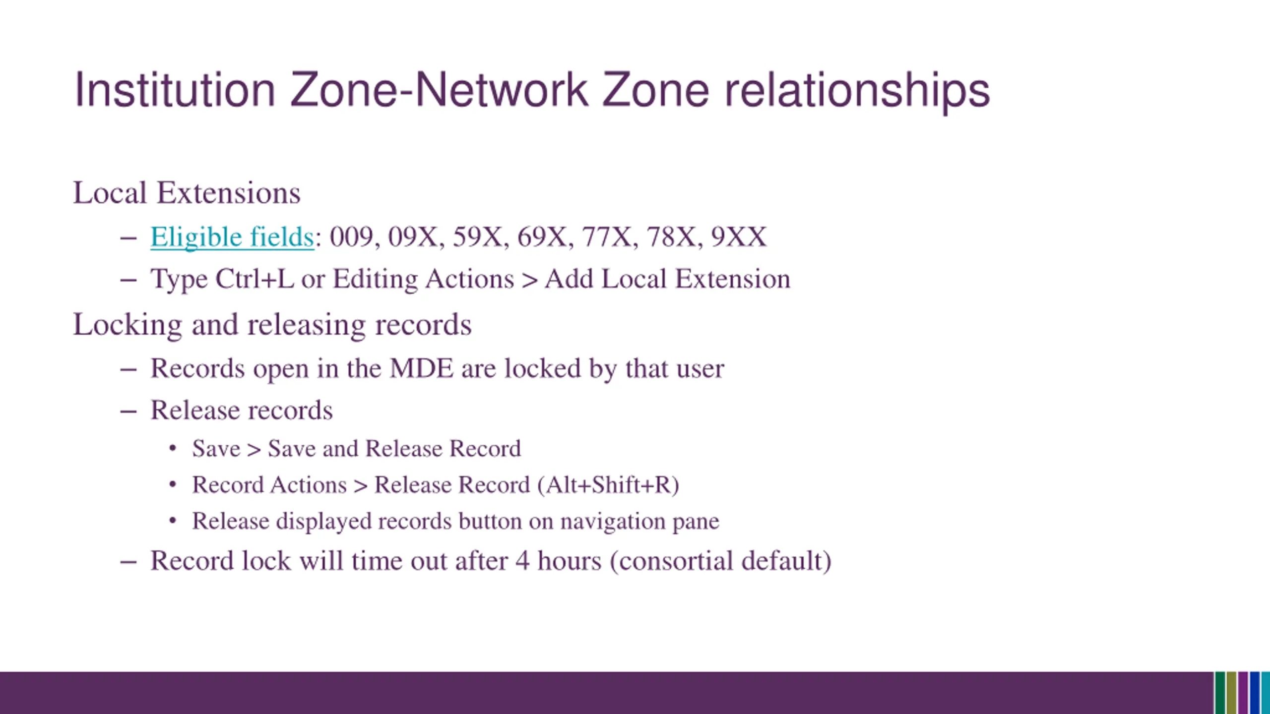 Institution Zone-Network Zone relationships Local Extensions Eligible fields: 009, 09X, 59X, 69X, 77X, 78X, 9XX Type Ctrl+L or Editing Actions > Add Local Extension Locking and releasing records Records open in the MDE are locked by that user Release records Save > Save and Release Record Record Actions > Release Record (Alt+Shift+R) Release displayed records button on navigation pane Record lock will time out after 4 hours (consortial default)