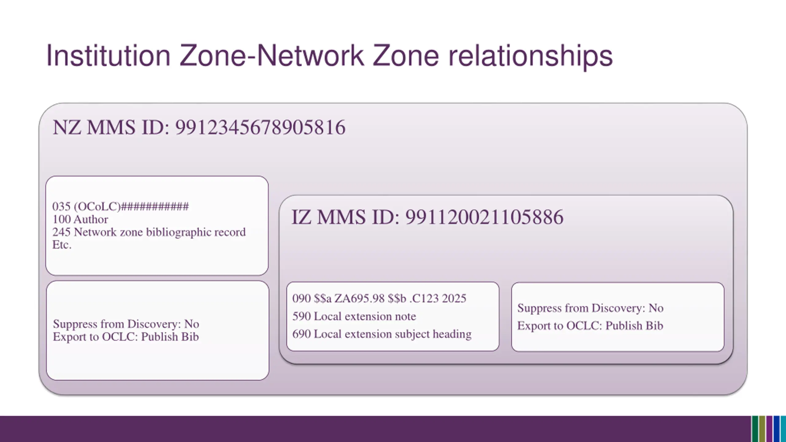 Institution Zone-Network Zone relationships NZ MMS ID: 9912345678905816 035 (OCoLC)########### 100 Author 245 Network zone bibliographic record Etc. IZ MMS ID: 991120021105886 090 $$a ZA695.98 $$b .C123 2025 590 Local extension note 690 Local extension subject heading Suppress from Discovery: No Export to OCLC: Publish Bib Suppress from Discovery: No Export to OCLC: Publish Bib