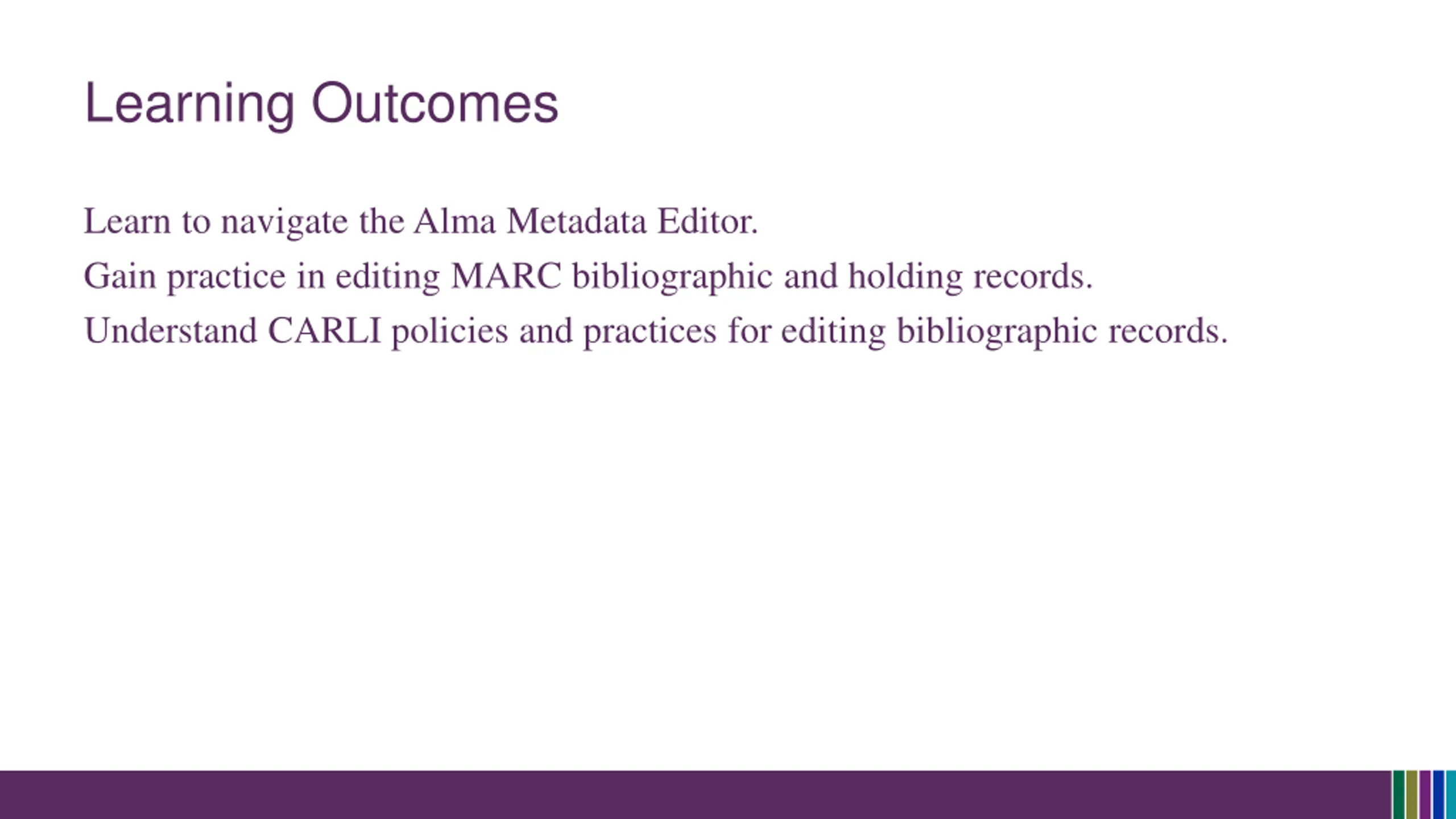 Learning Outcomes Learn to navigate the Alma Metadata Editor. Gain practice in editing MARC bibliographic and holding records. Understand CARLI policies and practices for editing bibliographic records.