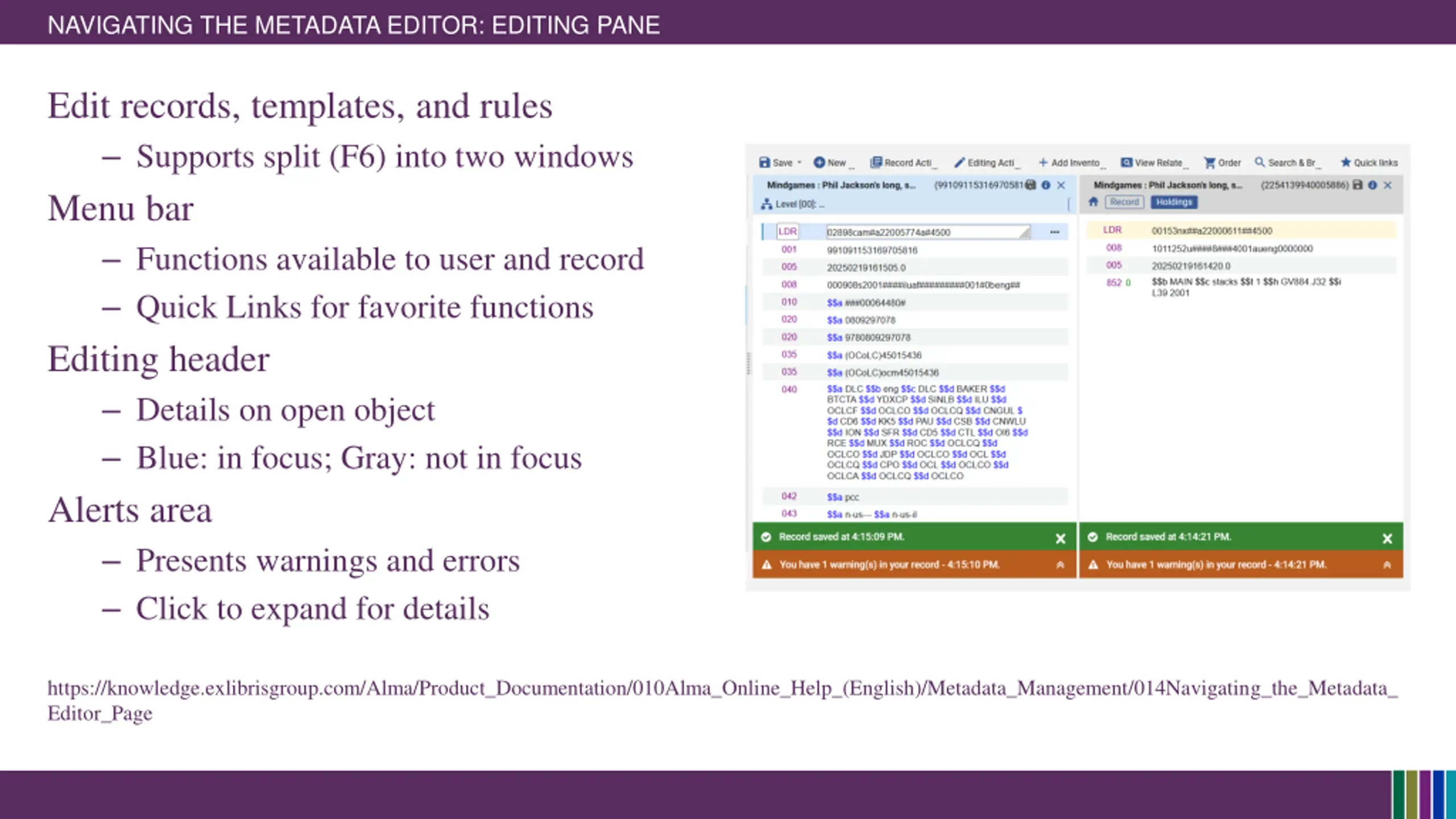 NAVIGATING THE METADATA EDITOR: EDITING PANE Edit records, templates, and rules Supports split (F6) into two windows Menu bar Functions available to user and record Quick Links for favorite functions Editing header Details on open object Blue: in focus; Gray: not in focus Alerts area Presents warnings and errors Click to expand for details https://knowledge.exlibrisgroup.com/Alma/Product_Documentation/010Alma_Online_Help_(English)/Metadata_Management/014Navigating_the_Metadata_ Editor_Page