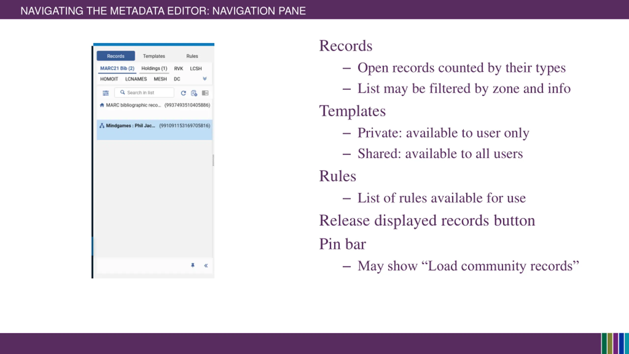 NAVIGATING THE METADATA EDITOR: NAVIGATION PANE Records Open records counted by their types List may be filtered by zone and info Templates Private: available to user only Shared: available to all users Rules List of rules available for use Release displayed records button Pin bar May show Load community records