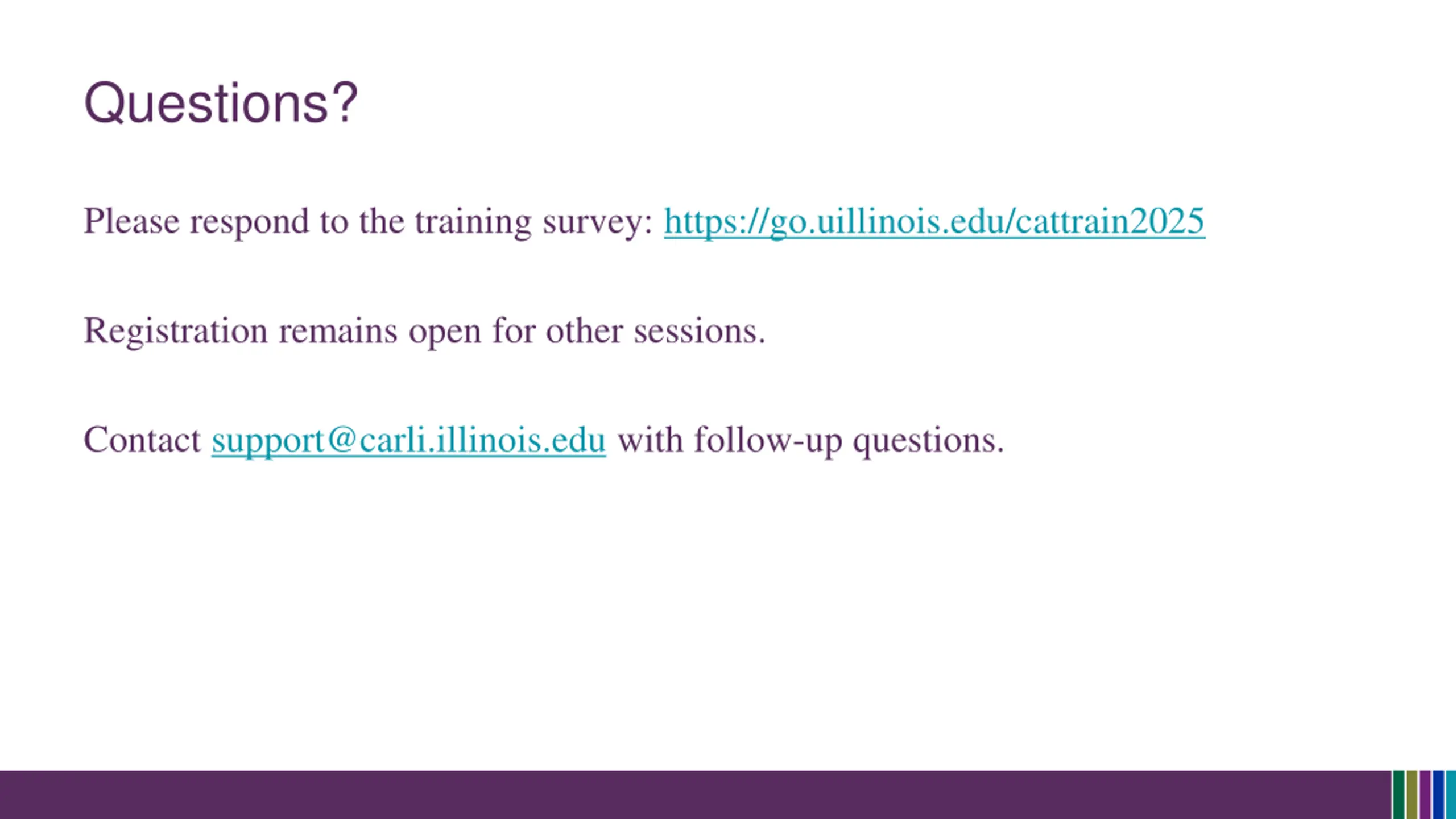 Questions? Please respond to the training survey: https://go.uillinois.edu/cattrain2025 Registration remains open for other sessions. Contact support@carli.illinois.edu with follow-up questions.