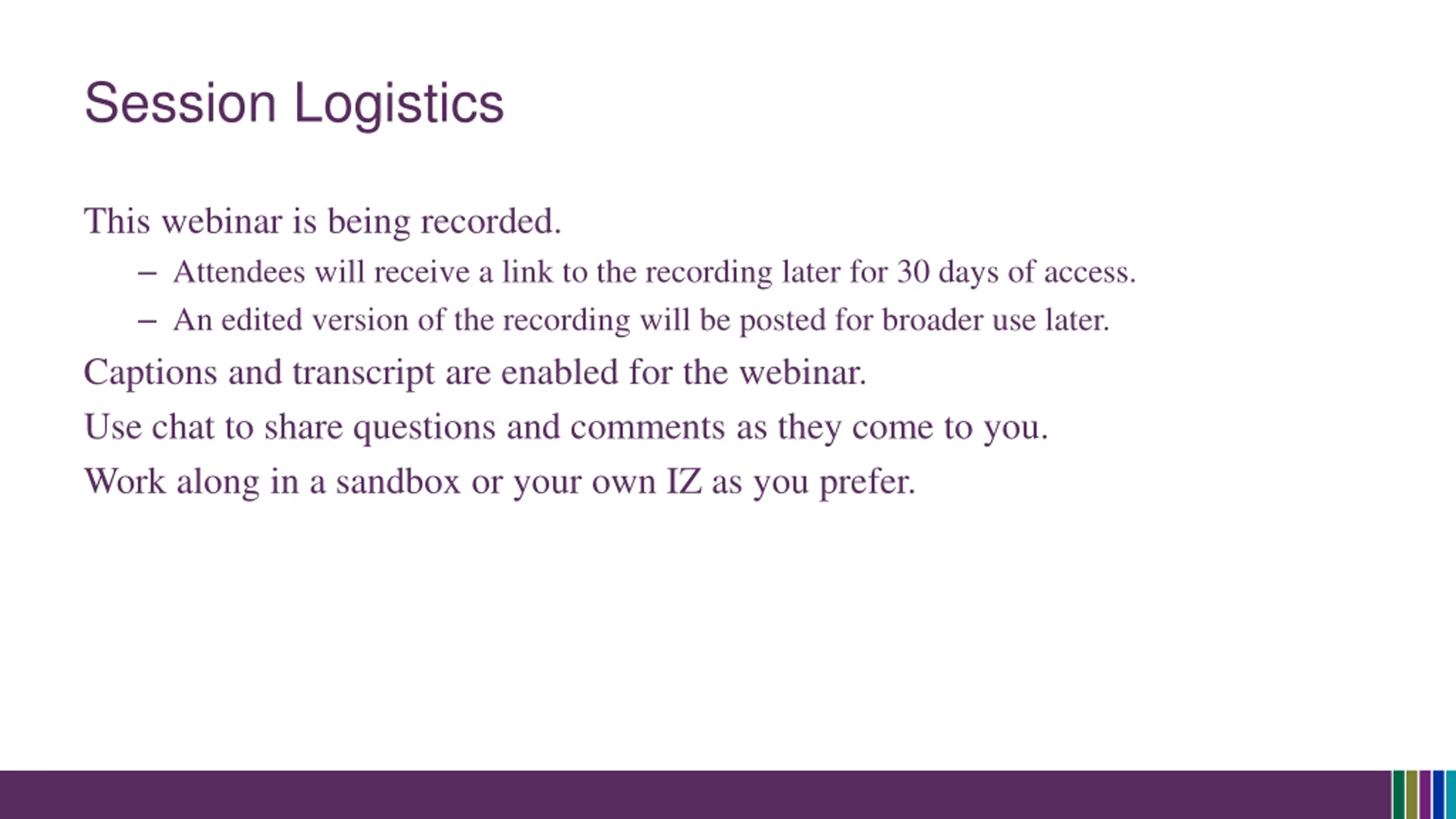 Session Logistics This webinar is being recorded. Attendees will receive a link to the recording later for 30 days of access. An edited version of the recording will be posted for broader use later. Captions and transcript are enabled for the webinar. Use chat to share questions and comments as they come to you. Work along in a sandbox or your own IZ as you prefer.