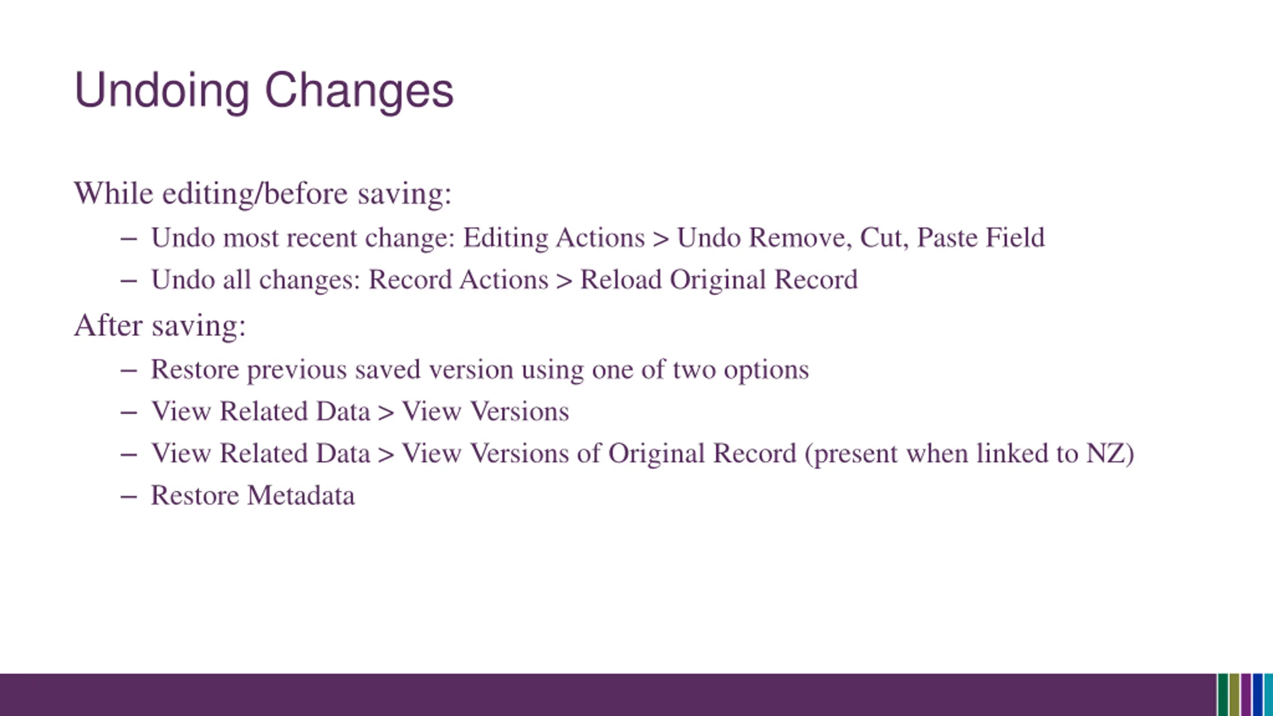 Undoing Changes While editing/before saving: Undo most recent change: Editing Actions > Undo Remove, Cut, Paste Field Undo all changes: Record Actions > Reload Original Record After saving: Restore previous saved version using one of two options View Related Data > View Versions View Related Data > View Versions of Original Record (present when linked to NZ) Restore Metadata