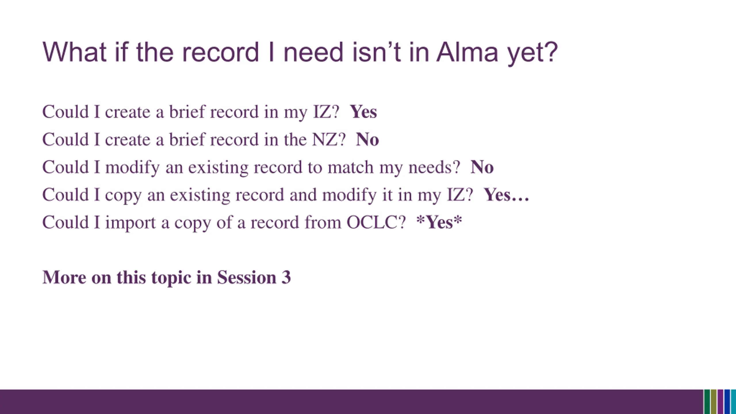 What if the record I need isnt in Alma yet? Could I create a brief record in my IZ? Yes Could I create a brief record in the NZ? No Could I modify an existing record to match my needs? No Could I copy an existing record and modify it in my IZ? Yes Could I import a copy of a record from OCLC? *Yes* More on this topic in Session 3